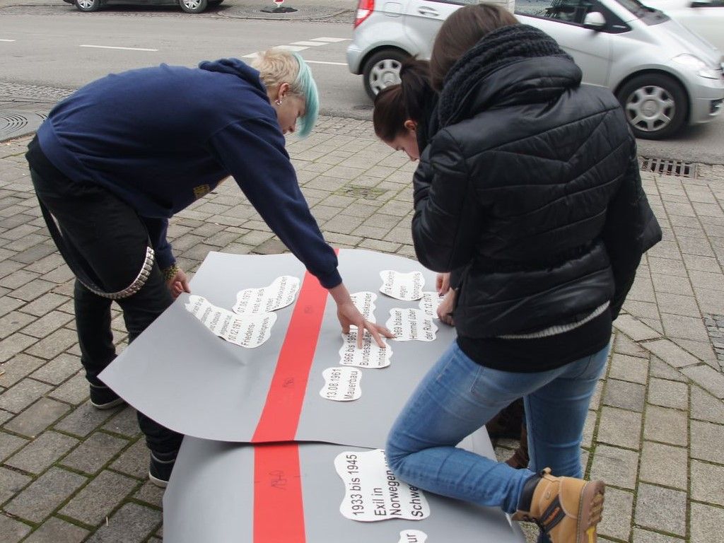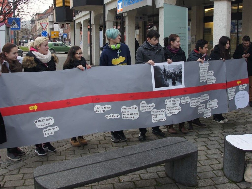 Die Klasse 10 der Silcherschule hat sich mit dem Leben des großen Staatsmanns und Friedensnobelpreisträger befasst und als überdimensionalen Lebenslauf zusammengestellt. Ergänzt wurde diese große Lebenslinie mit Zitaten von Willy Brandt, die zur Eröffnung der Geburtstagsfeier vorgetragen und angeheftet wurden. |