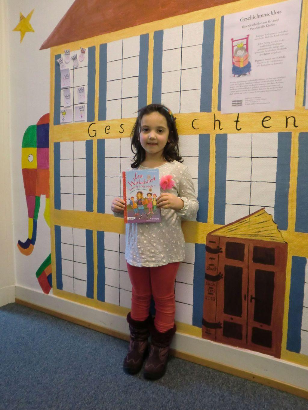 Jedes Kind wird für den Besuch des Geschichtenschlosses zudem mit einem Stempel belohnt. Vor kurzem wurden die Gewinnerkinder 2013 ermittelt, die sich die meisten Stempel erworben haben. Bei den Mädchen sammelte Elisa Nicolosi die meisten Stempel. Marco Fernandez hatte bei den Jungen erneut die Nase vorn. Beide Kinder bekamen von Heike Stieper von der Stadtbücherei ein Buchpräsent überreicht. „Über die ganzen Jahre hatten wir unsere Vorleseraupe, die die Besuche der Kinder dokumentierte“, erzählt Sarah Ripp von der Stadtbücherei, „aber für dieses Jahr haben wir uns etwas Neues einfallen lassen“. Seit Januar ziert das „Eislinger Schloss“ in Kleinformat die Kinderbücherei im zweiten Stock. Nach einer Fotografie des Originals hat Heike Stieper das Schloss eins zu eins an die Wand gebracht. „Jedes Kind, darf nun quasi in das Schloss einziehen, wenn es das Geschichtenschloss regelmäßig besucht“, so Heike Stieper. Die Vorlesepaten knipsen nach dem Vorlesen von jedem Kind, das fotografiert werden möchte, ein Bild, welches dann in eines der Fenster des Schlosses angebracht wird. Oder die Kinder malen sich ihr Gesicht auf Papier und bringen es selbst an. Auf diese Weise wird das Schloss im Laufe des Jahres von immer mehr Kindern bewohnt.