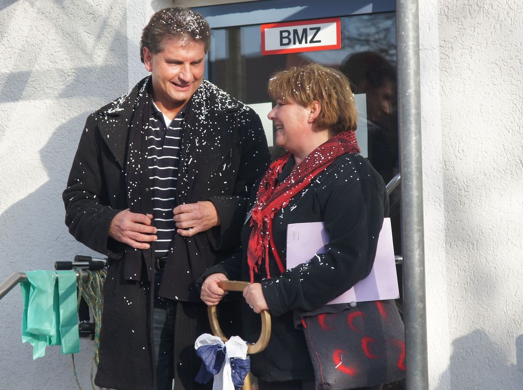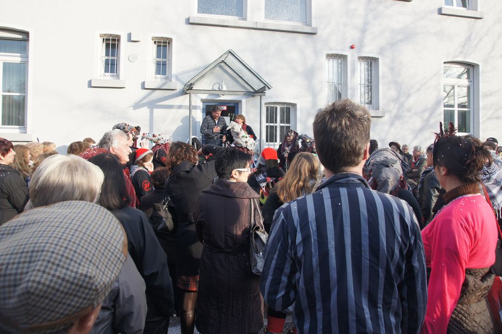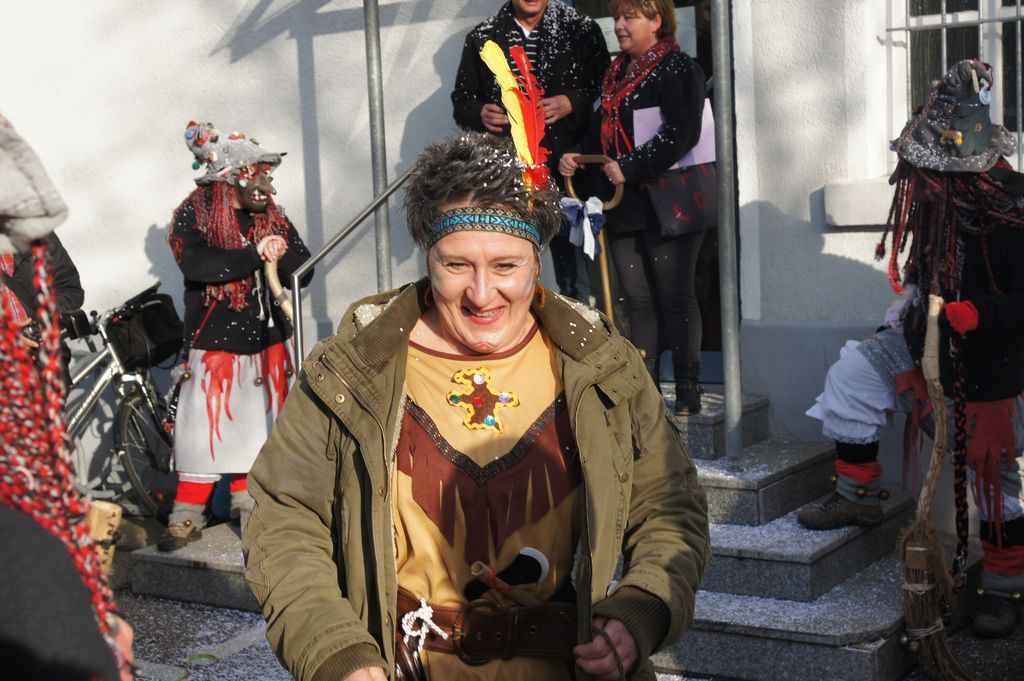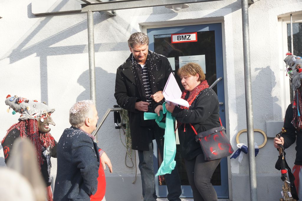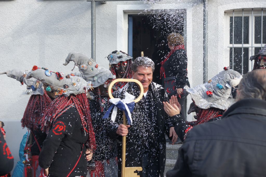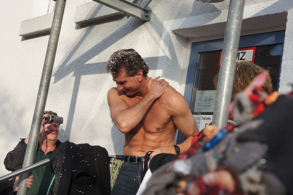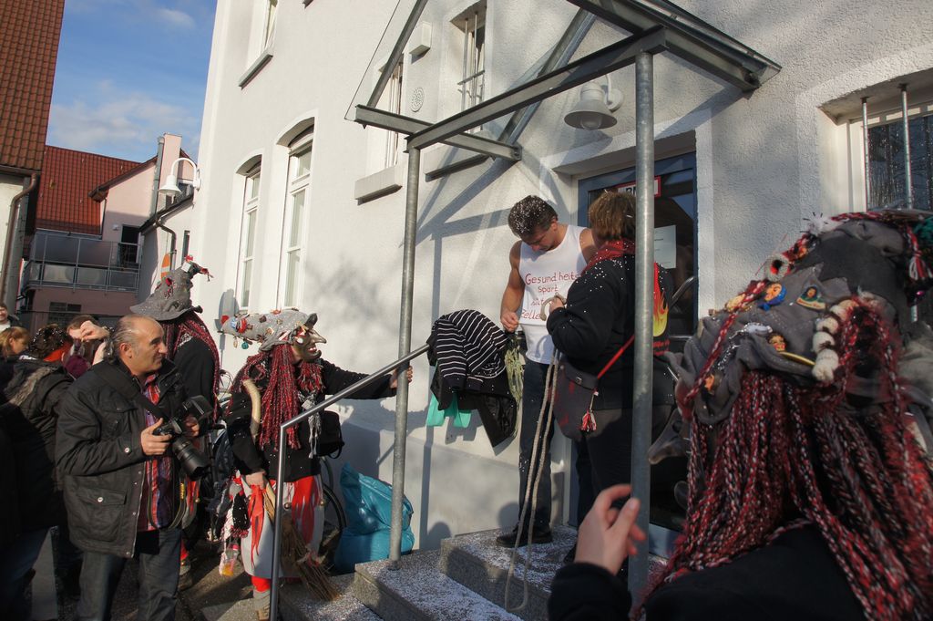 Der Rathaussturm der Brandstifterhexen entpuppte sich als Leibessportübung. In Anspielung auf das Gesundheitsmanagement der Stadt wollten die Narren einmal die Fitness des Stadtoberhaupts testen. Natürlich im muscle shirt, so dass OB Heininger sich erst einmal vor allen Augen umziehen musste. |