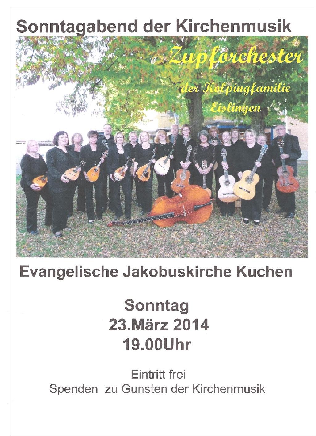 Am Sonntag den 23. März um 19.00 Uhr spielt das Zupforchester der Kolpingsfamilie Eislingen unter der Leitung von Heidemarie Güller in der Jakobuskirche in Kuchen.