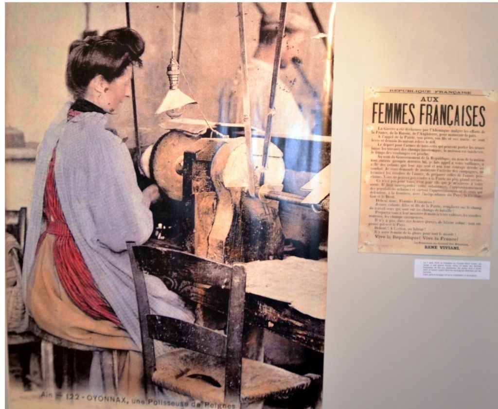 Auf Nachfrage teilte er uns mit, dass er im Moment auf Vermittlung von Françoise Collet und Noël Dupont ein Praktikum für 6 Wochen in Oyonnax im Centre Culturel Aragon mache. Im Rahmen der Vernissage der Ausstellung über die Frauen im ersten Weltkrieg sei dieses Foto entstanden. Die Ausstellung beinhaltet Fotos von Frauen, die verschiedenen Tätigkeiten ausführen, da viele Männer im Krieg gefallen waren und deren Tätigkeiten nun ersetzt werden mussten. Aber auch Bilder auf denen Munition produziert wurde. Es soll einfach an die Frauen im Krieg erinnert werden, die ebenfalls in große Leistung erbracht haben.