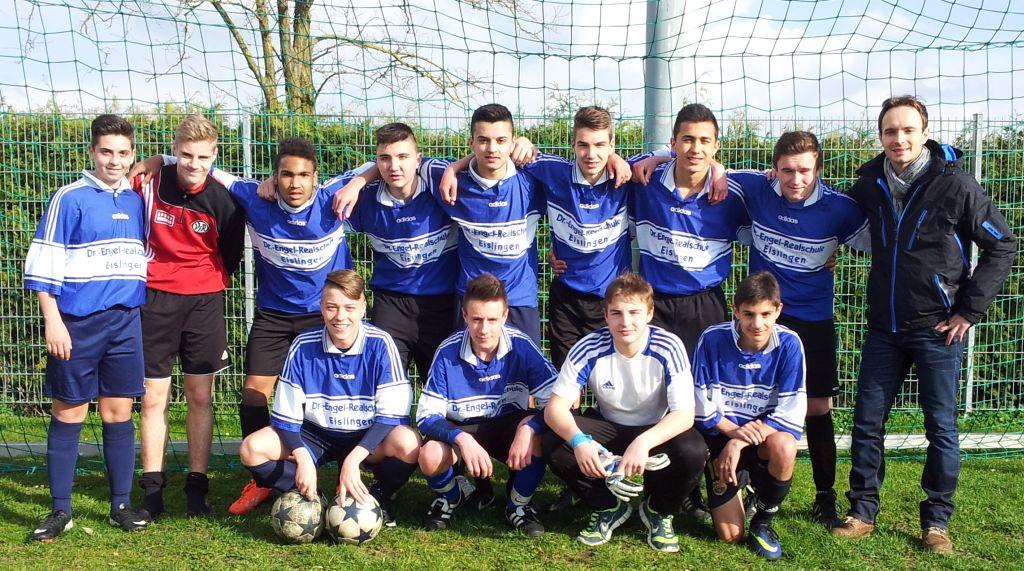 Die Mannschaft der Dr.-Engel-Realschule musste im zweiten Spiel gegen den Verlierer des ersten Spiels, das Mörike Gymnasium, antreten. Von Beginn an wurde deutlich, dass der Gegner den Realschülern nicht viel entgegen setzen konnte. Gleich in der ersten Minute nutzte Sandro einen Fehler der gegnerischen Abwehr und erzielte mit einem strammen Schuss unter die Latte aus zehn Metern das wichtige 1:0 für Eislingen. Nach einem Freistoß in der 13. Minute konnte Innenverteidiger Zeki mit einem Kopfball das 2:0 erzielen. Mit diesem Ergebnis ging es in die Halbzeit. Gleich nach der Pause folgte schon das 3:0 durch David. Er konnte einen schönen Querpass von Marco am Torwart vorbei ins Tor schieben. In der 30. Minute konnten die Göppinger durch einen Handelfmeter zum 3:1 verkürzen. Kurz vor Schluss war es dann Marco, der mit einem schönen Sololauf über die rechte Seite das Endergebnis von 4:1 vollendete.