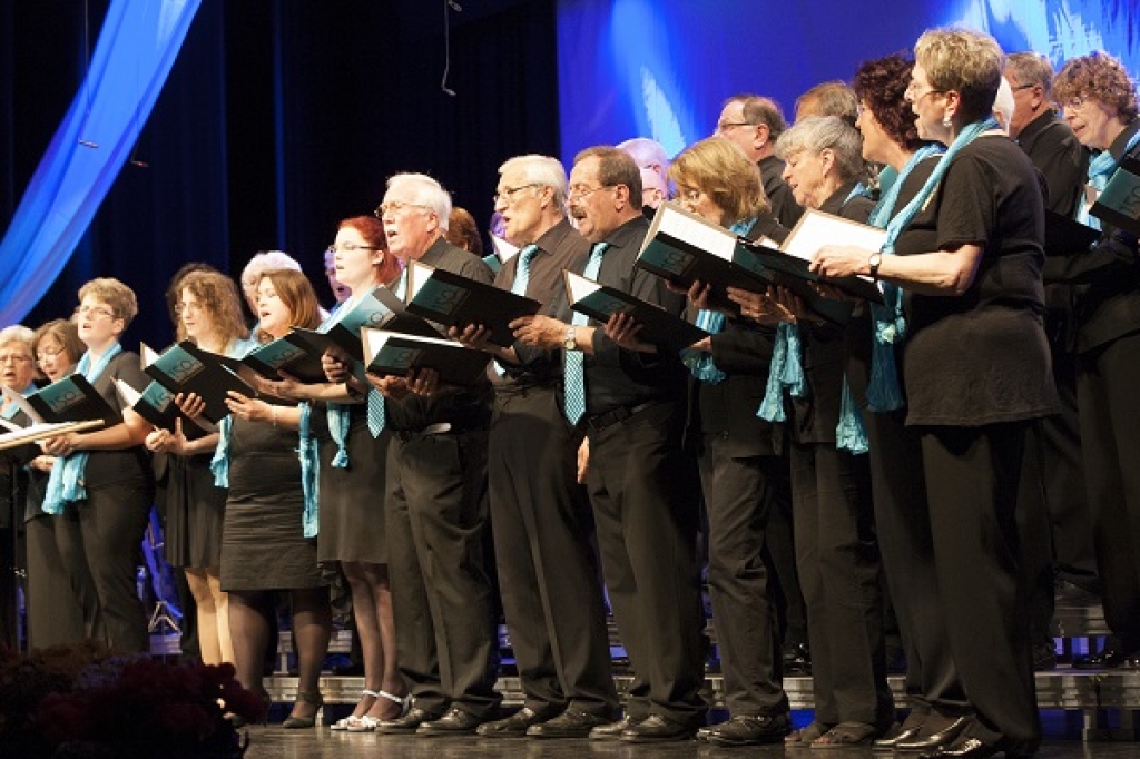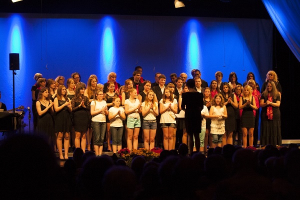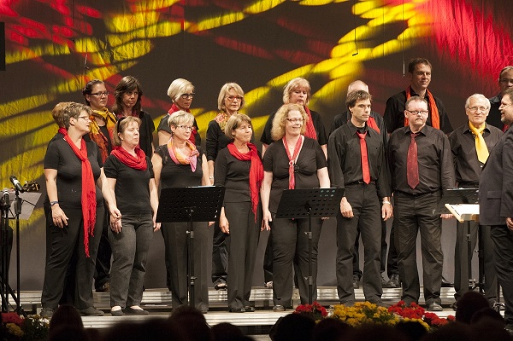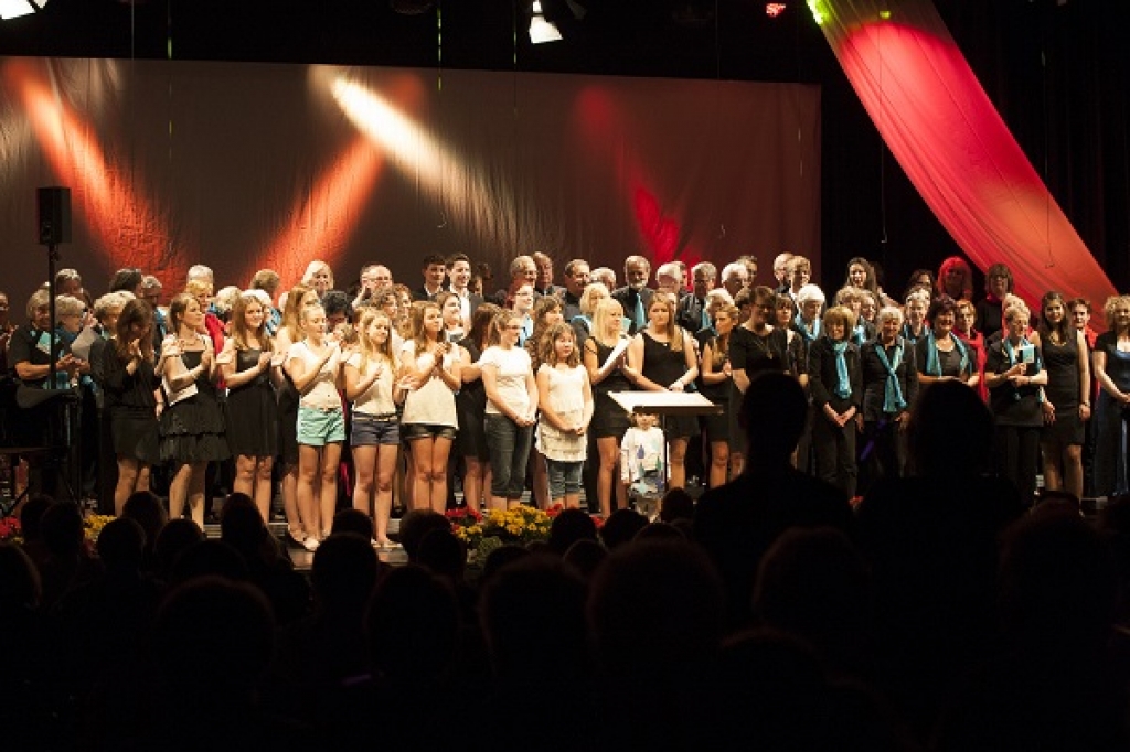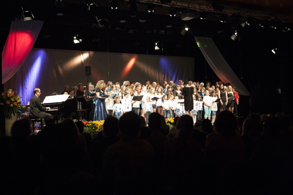 Felix Heller und Isabelle Boslé ließen während der Bühnen-Umbauzeiten keine Langeweile aufkommen. Das Moderatorenpaar trug Gedichte humorigen Inhalts vor, erntete Beifall und manches Schmunzeln. Eine Combo mit Gregor Kissling am Klavier begleitete alle Chöre passgenau. Zum Schluss war das Publikum eingeladen mit zu agieren, was gerne angenommen wurde. Bunte Leuchtstäbchen flirrten durch die Stadthalle, sehr stimmungsvoll. Lang anhaltender, herzlicher Beifall war der Lohn für alle Mitwirkenden.