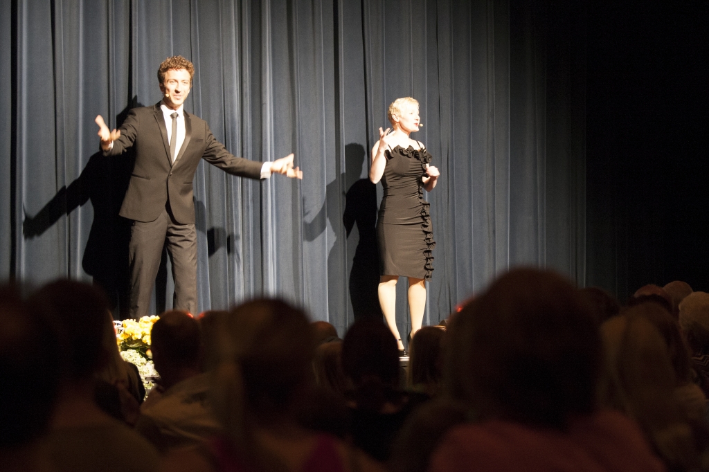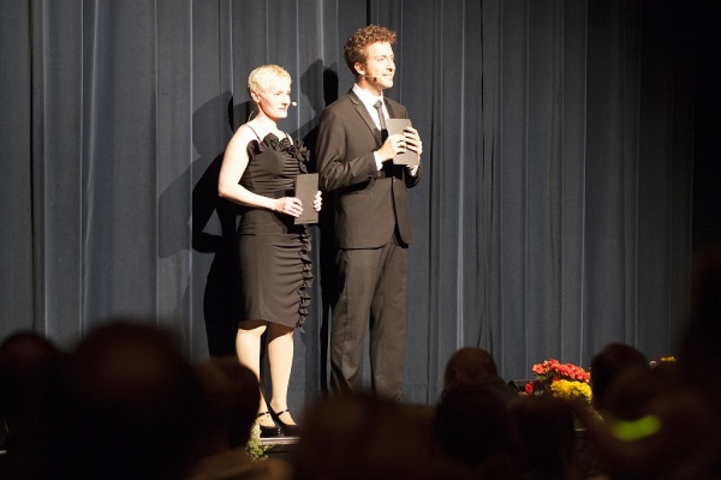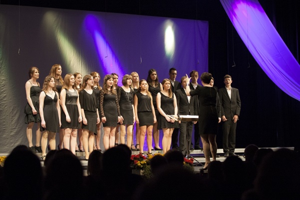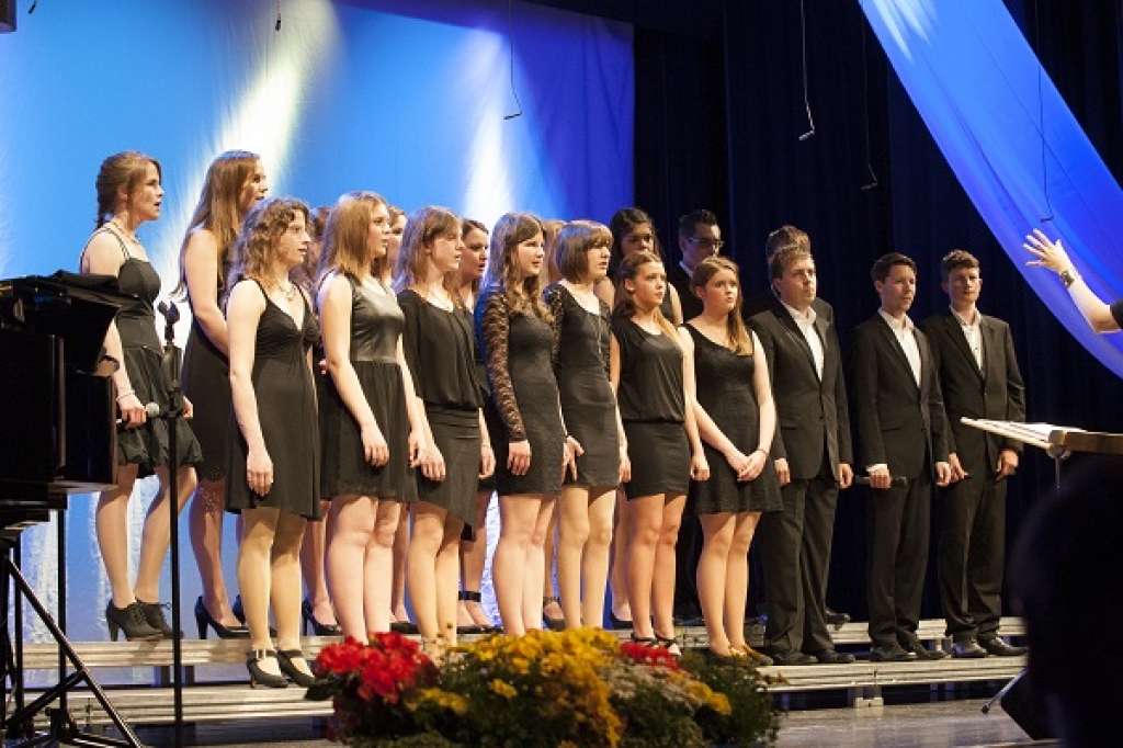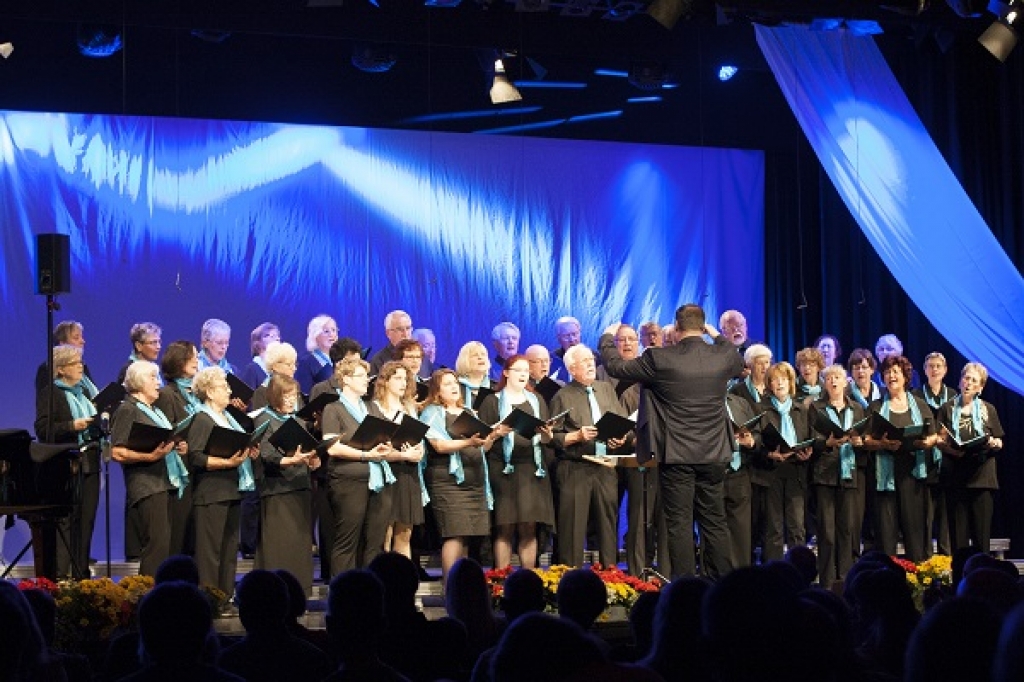 Felix Heller und Isabelle Boslé ließen während der Bühnen-Umbauzeiten keine Langeweile aufkommen. Das Moderatorenpaar trug Gedichte humorigen Inhalts vor, erntete Beifall und manches Schmunzeln. Eine Combo mit Gregor Kissling am Klavier begleitete alle Chöre passgenau. Zum Schluss war das Publikum eingeladen mit zu agieren, was gerne angenommen wurde. Bunte Leuchtstäbchen flirrten durch die Stadthalle, sehr stimmungsvoll. Lang anhaltender, herzlicher Beifall war der Lohn für alle Mitwirkenden.