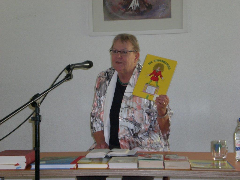 Barbara Oberacker begann danach ihre Überlegungen und Betrachtungen mit Martin Luther. Dank seiner Bibelübersetzung in die deutsche Sprache wurde erst durch die Bibel, den Katechismus, die Spruchbüchern und Lieder das Lesen fürs allgemeine Volk zur Selbstverständlichkeit. Sie las aus dem allseits bekannten „Struwwelpeter“ von Dr. H. Hofmann und aus Wilhelm Buschs “Max und Moritz“ den Streich an Lehrer Lämpel mit dem explodierenden Pfeifenkopf. Weiter berichtete B. Oberacker über das Leben von Johanna Spyri, die über 100 Bücher geschrieben hat. Als um 1950 wieder die ersten Kinderbücher gedruckt wurden, wurde „Heidi“ das bekannteste. Sie las uns die anrührende Szene vor, in der Heidi den Kontakt zu ihrem Großvater aufnimmt und ihren neuen Lebensraum erkundet. Weiter ging es mit Erinnerungen an die Schulausflüge in jener Zeit. Diese führten oft in die Höhlen der Schwäbischen Alb. Man las „Rulaman“ und „die Höhlenkinder“, Bücher mit Heimatbezug, dadurch waren schwäbische Kinder Experten in Sachen Steinzeit! Der größte deutsche Kinderbuchautor Erich Kästner wurde 1899 in Dresden geboren und arbeitet als Journalist in Berlin. Dort schrieb er „Das doppelte Lottchen“, „Emil und die Detektive“ und viele andere. Die Nazis verbrannten seine Bücher und er verbrachte den Rest seines Lebens in München. Als Leseprobe hörten wir aus dem „doppelten Lottchen“ die Szene beim Kinderheim in Seebühl am Bühlsee, als sich bei der Ankunft der neuen 20 Mädchen Luise und Lotte das erste Mal begegnen. Nach dem gemeinsam gesungenen Loreley-Lied folgte Kästners Gedicht “der Handstand auf der Loreley“. Die weltweit bekannteste Kinderbuch-autorin ist Astrid Lindgren. Die gewaltfreie Kindererziehung geht auf ihre Bücher zurück. Ihre Biographie und ihr Wirken betrachtete B. Oberacker ganz besonders. Wer kennt nicht „Pippi Langstrumpf“, „Michel als Lönneberga“ oder „Ronja Räubertochter“. Beispielhaft rezitierte sie aus dem Brief Astrid Lindgrens an ihren Sohn („Mein Sohn liegt in meinem Arm“), der sehr anrührend deren Gefühle schildert.