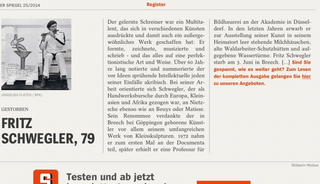 Der im Alter von 79 Jahren verstorbene Künstler Fritz Schwegler wurde im aktuellen Spiegel mit einem Nachruf gewürdigt.