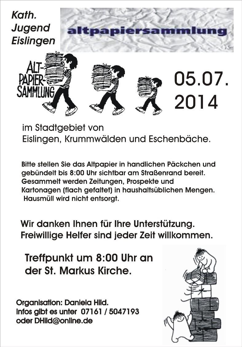 Am 5. Juli 2014 sammelt die kath. Jugend Eislingen im Stadtgebiet Eislingen, Krummwälden und Eschenbäche Altpapier.
