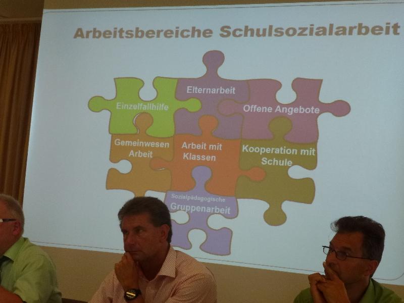 Die Palette der Schulsozialarbeit reicht von der Verbesserung des Lern- und Sozialverhaltens, über den Abbau von Schwierigkeiten beim Übergang von der Schule in die Ausbildung, bis zu Konflikten im Elternhaus oder Scheidungskonflikte. Insbesondere Einzelfallhilfe und Elternarbeit nähmen immer mehr ihrer täglichen Arbeit in Anspruch, berichteten die anwesenden Schulsozialarbeiterinnen und Schulsozialarbeiter. Da bleibe kaum noch Zeit für weitere Schwerpunkte, wie z.B. schulübergreifende Projekte oder sozialpädagogische Gruppenarbeit.