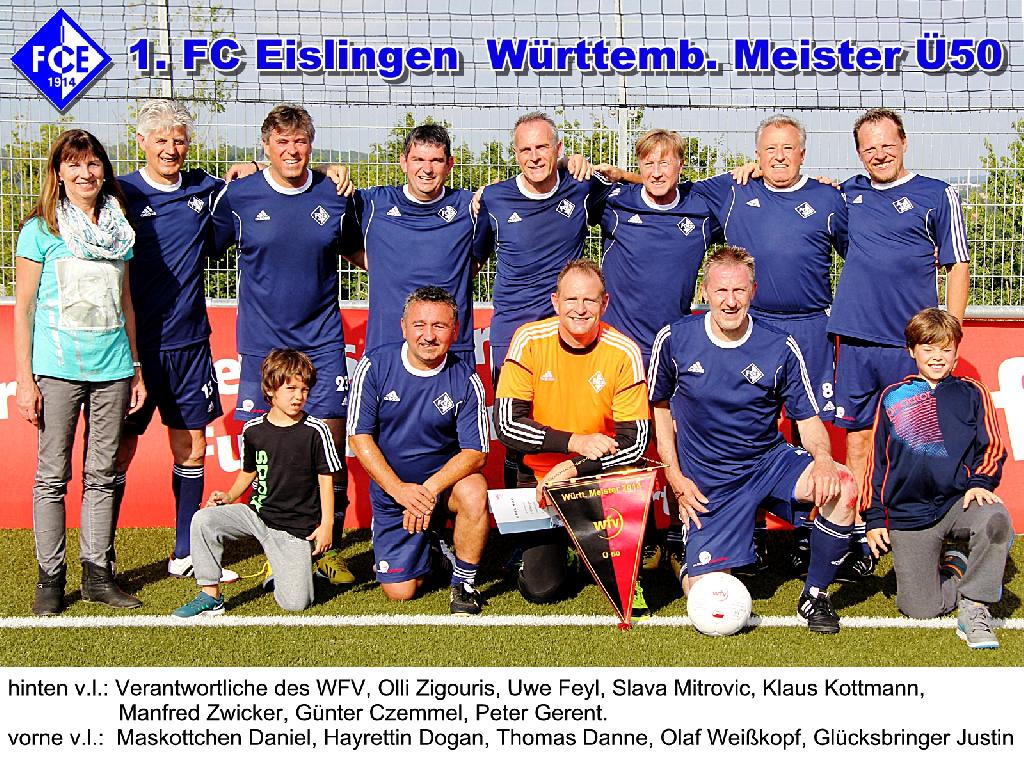 Die Oldies des 1.FC Eislingen holten sich nach 2012, passend zum 100 jährigen Vereins Jubiläum, bei der zum dritten mal ausgetragenen Württembergischen Ü50 Meisterschaft zum zweiten mal den Titel und qualifizieren sich damit für die Süddeutsche Meisterschaft die am 2. August in der Nähe von Nürnberg ausgetragen wird.