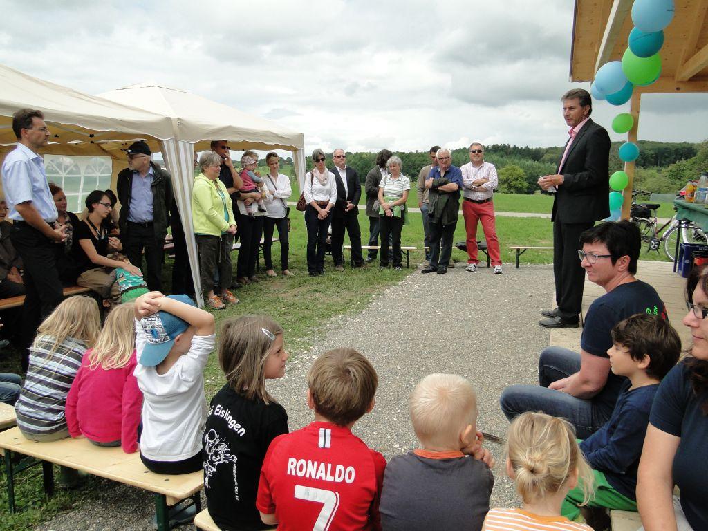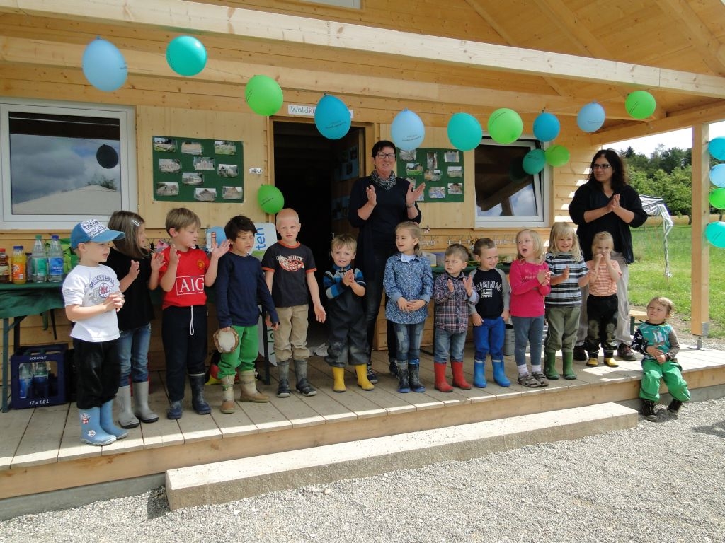 Mit Gummistiefeln und Buddelhosen waren die Kinder bei der Einweihung des Blockhauses für den Waldkindergarten ausgestattet. Passend dazu schickte Petrus in der halben Stunde der Einweihung Sonne und Regen im Wechsel. 'Man sieht, es gibt kein schlechtes Wetter, sondern nur die falsche Kleidung', stellte Oberbürgermeister Klaus Heininger schmunzelnd fest.