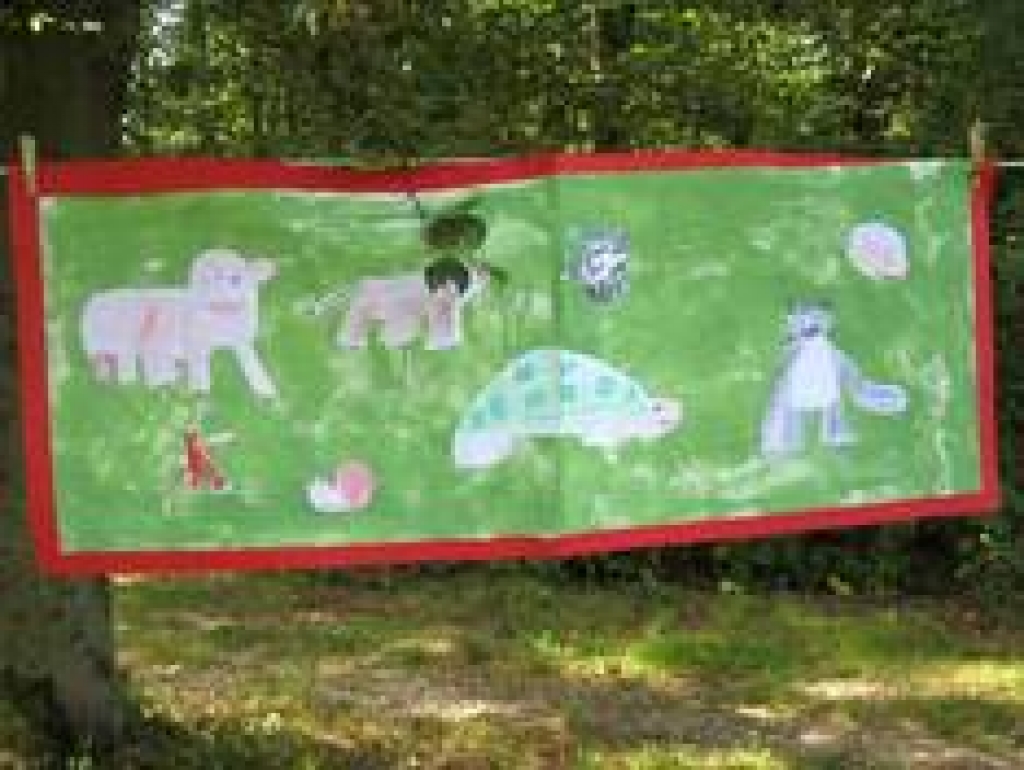 Der Inhalt des Gottesdienstes, der zuerst gefeiert wurde, war die Schöpfungsgeschichte. Gott schuf die Welt und alles, was darin ist, lebt und wächst. So wunderbar hat Gott alles gemacht und dafür wurde Gott danke gesagt durch die Lieder, die Gebete und die Bilder, die die Kinder gemacht hatten.