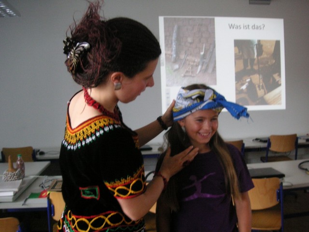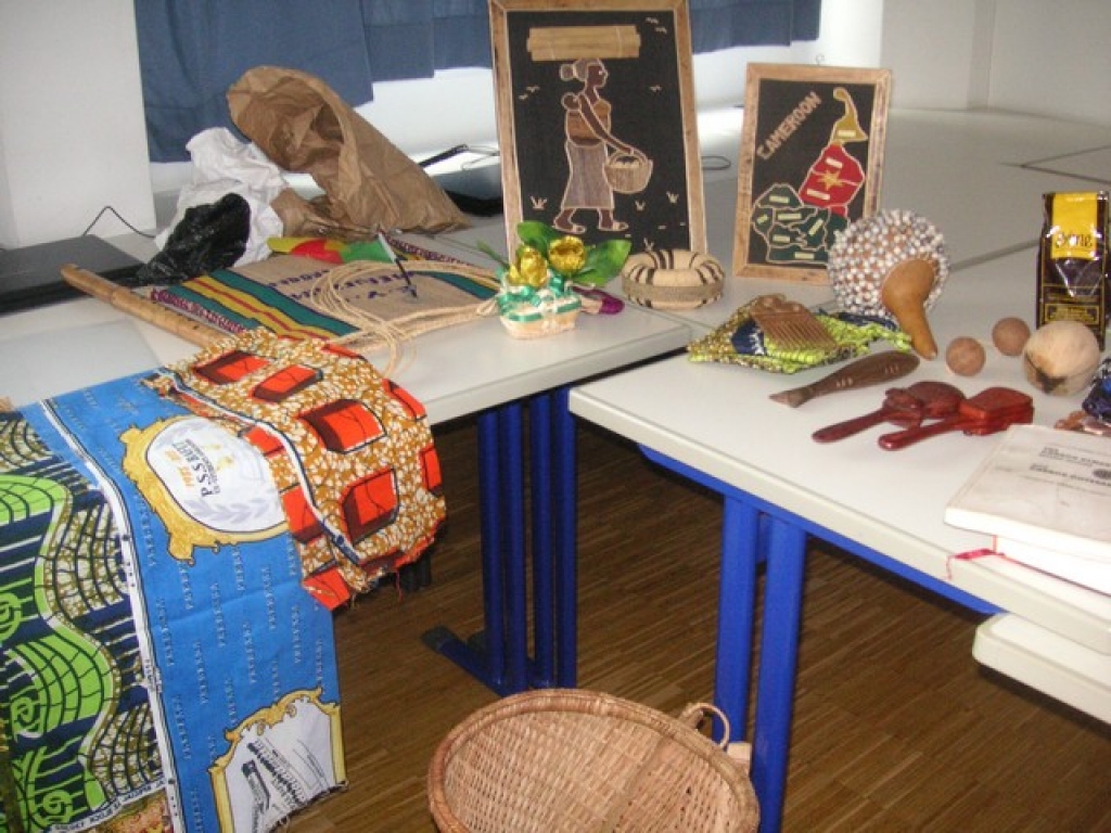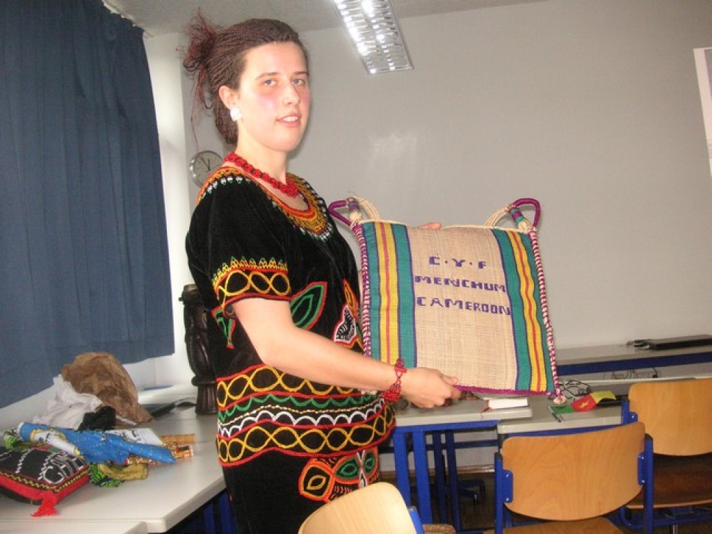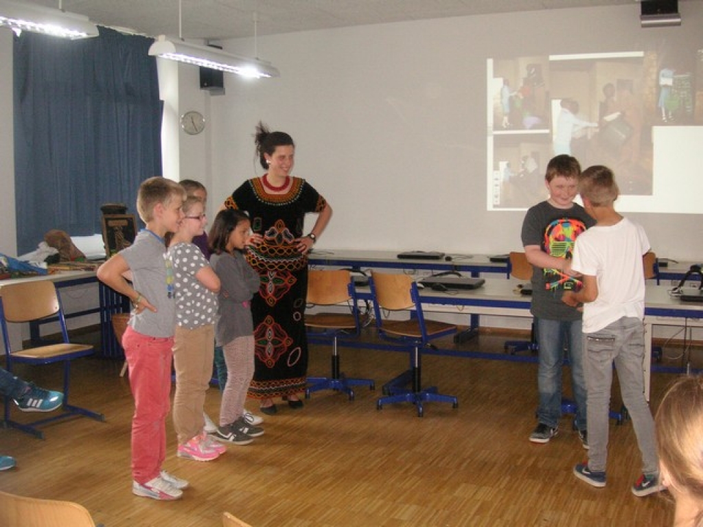 Mit Kameruner Haartracht und Kleidung kam sie nun an die Silcherschule und erzählte den Kindern der Klasse 4c Näheres über den Schulalltag und die Lebensumstände der Kameruner Kinder: