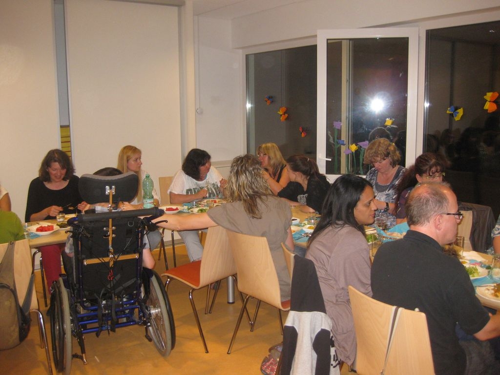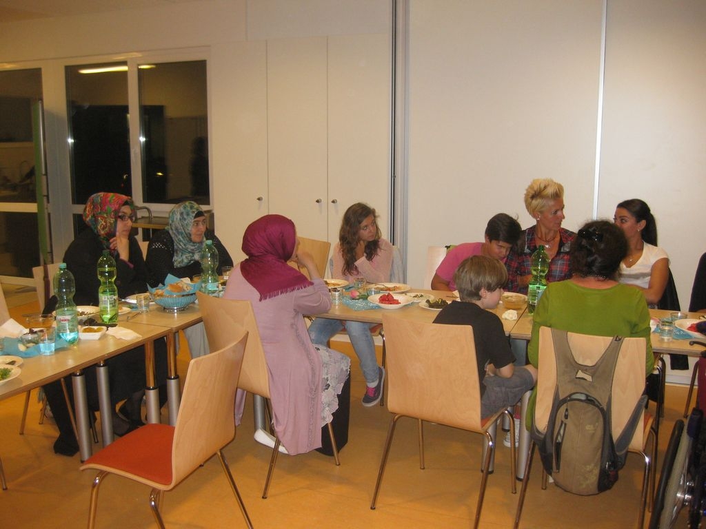 Leise, zarte und wohlklingende Töne einer türkischen Flöte klangen am Freitagabend durch die Räume des Kinder- und Familienzentrums (KiFaZ) der Christuskirche Eislingen. An diesem Abend hatte eine türkische Familie zum Fastenbrechen eingeladen und den Eingangsbereich des Kindergartens in einen festlichen Saal verwandelt. Die Tische waren mit türkisblauen Servietten, weißen und rosafarbenen Rosen und weißen Kieselsteinen festlich geschmückt. Und so begegneten sich viele verschiedene Menschen in den hellen, freundlichen Räumen der „Neuen Rosalie“: fleißige Frauen und Mädchen, die leckere türkische Speisen zubereitet und mitgebracht hatten, zahlreiche neugierige Gäste, Familien, Erzieherinnen und viele vergnügte Kinder. Noch war etwas Zeit und ein türkischer Familienvater erzählte von der Bedeutung und Gestaltung des Fastenmonats „Ramadan“. Und dann begann pünktlich nach Sonnenuntergang um 21.32 Uhr das festliche Essen und unterschiedlichste Köstlichkeiten wurden dargeboten: gezuckerte Datteln mit Walnüssen gefüllt, eine schmackhafte Linsensuppe, gefüllte Weinblätter, Reis mit Hühnerfleisch, ein in Auberginenmantel verstecktes „Fleischküchle“, Erbsenschoten-Kartoffelgemüse, verschiedene Salate, Kartoffelmedaillons, Brote, Melonenstücke, zuckersüße Kuchen… und zum Abschluss - ein heißer Cay. |