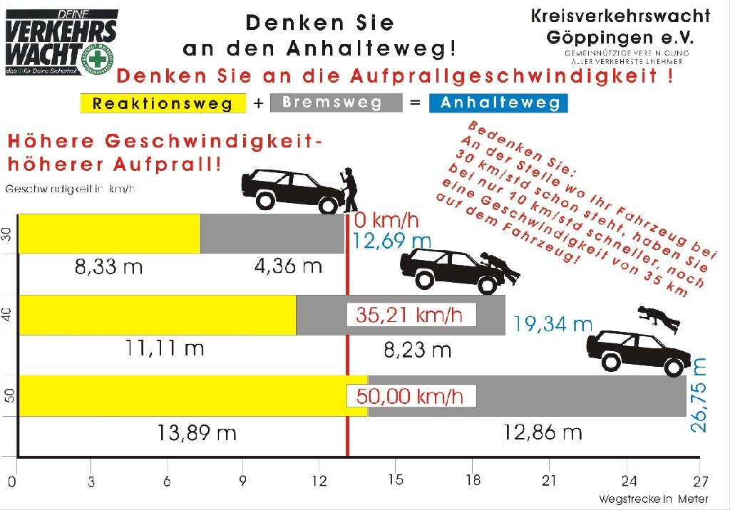 Fahren Sie in der Zone 30 nicht schneller – denken Sie an den Anhalteweg. Beachten Sie, dass ihr Fahrzeug mit einer Geschwindigkeit von 40 km/std an der Stelle an welcher es bei 30 km/std bereits stehen würde, noch mit einer Geschwindigkeit von rund 35 km/std sich bewegt. .