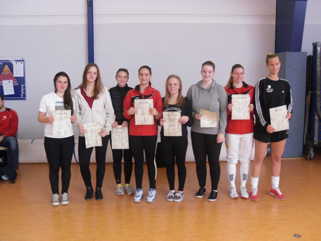 (Eislingen) „Klein aber fein“, unter diesem Motto könnte am 12.10.2014 die Baden-Württembergische Juniorenmeisterschaft (Jahrgänge 1995 und jünger) der Damen und Herren im Säbelfechten gestanden haben. Bei nur rund 35 Teilnehmern siegten die gleichen Athleten, die sich im Frühsommer diesen Jahres die Titel der „Deutschen Meisterin Junioren“ und des „Deutschen Meisters A-Jugend“ erkämpften. Baden-Württembergische Meisterin bei den Damen wurde Ann-Sophie Kindler, die kürzlich auch als Sportlerin des Jahres der TSG Eislingen ausgezeichnet wurde. Simon Rapp von der TSG Eislingen schaffte es bei den Herren. Mit anderen Worten: Die baden-württembergische Meister sind auch deutsche Meister und kommen aus Eislingen. Eislingen mit seiner TSG rangiert in der Fechtwelt damit bundesweit ganz weit oben, wird überall erwähnt und ist damit sehr bekannt. von rechts: Ann-Sophie Kindler, Valentina Volkmann (beide TSG Eislingen) Svenja Heins (FC Würth Künzelsau), Kira Eifler (FC Tauberbischofsheim), Carol-Ann Kuhn (TSG Eislingen), Luzia Hirn (FC Würth Künzelsau), Cara Ottenbacher (FC Tauberbischofsheim), Pia Van gen Hassend (FC Werbach) |