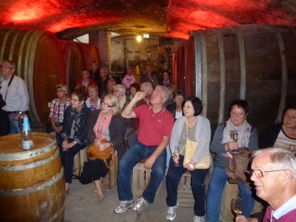 Danach ging es weiter entlang der Deutschen Weinstraße nach Bad Dürkheim zum Weingut Fitz-Ritter. Bei einer Führung wurde allen die Weinkultur dieser Gegend vom Rebstock bis zum Wein und Sekt erklärt. Sehenswert war auch ein Rundgang durch den Gutspark mit exotischen Bäumen und eigenem Hausweinberg in bester Lage sowie der 225-jährige Gewölbekeller mit Holzfässern. Nach einer Sektprobe sowie mehreren Weinproben waren die meisten Reiseteilnehmer in sehr gehobener Stimmung. Anschließend wurde noch das größte Holzfaß der Welt in Bad Dürkheim besichtigt.