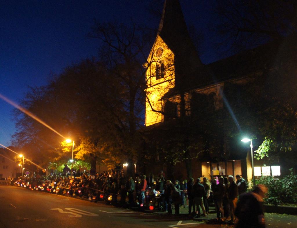 Dieses Jahr drei Tage vorher, und damit wie die letzten Jahre am Samstag abend teilte St.Martin hoch zu Ross seinen Mantel mit dem frierenden Bettler. Eine Geschichte, die Jahr für Jahr die Kinder mit ihren zum größten Teil selbstgebastelten Laternen, in ihren Bann zieht. |