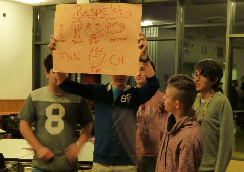 In der Mensa im Ösch versammelten sich zu diesem Anlass die Schülerinnen und Schüler mit ihren Lehrern und Schulsozialarbeitern. Die Jugendlichen boten ein abwechslungsreiches Programm dar, bei dem sie präsentierten, was sie seit Juni 2014 in den fünf Treffen mit Herrn Keim erarbeitet hatten.