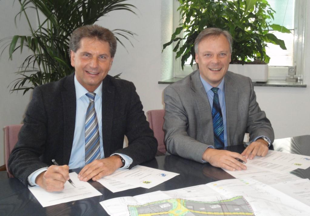 Mit der Unterschrift unter den gemeinsamen Vertrag haben jetzt beide Schultes vergangenen Donnerstag die formalen Voraussetzungen zur Erschließung des neuen Eislinger Gewerbegebiets geschaffen. Der offizielle Start der Baumaßnahme ist für Frühjahr 2015 vorgesehen.
