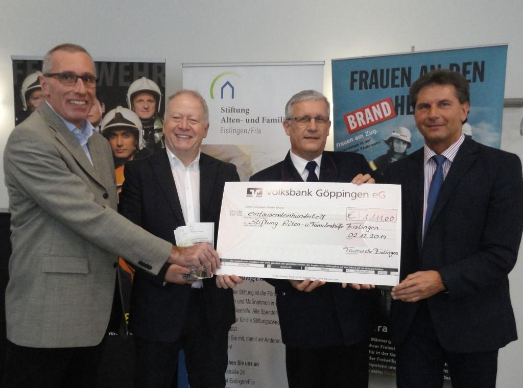 Als Vorsitzender des Stiftungsbeirats freute sich Oberbürger-meister Klaus Heininger über die Besonderheit bei dieser Scheckübergabe: „Hier unterstützt eine Hilfsorganisation eine andere Hilfsorganisation und greift ihr mit dieser Spende finanziell unter die Arme“, freute er sich bei der Scheckübergabe. Bürgermeister Herbert Fitterling bedankte sich als Vorsitzender des Stiftungsvorstandes bei allen Feuerwehrkameraden der Eislinger Wehr für den Einsatz dieser guten Sache und führte dazu aus, dass die Stiftung mit ihren Zinseinnahmen seit Jahren soziale Projekte in Eislingen finanzieren könne.
