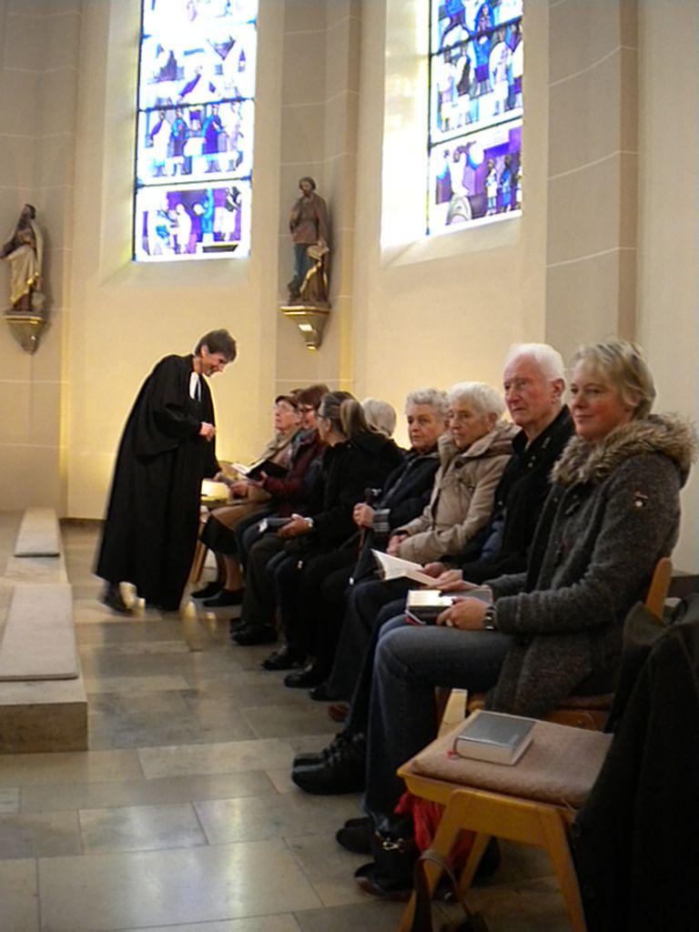In der St. Markus-Kirche in Eislingen ging es am vergangenen Samstag etwas anders zu als gewöhnlich. Altbekannte Weihnachtslieder und der Duft nach Orangen und Zimt lockten sowohl Betroffene als auch Angehörige und Interessierte in die Kirche. In lockerer Runde saß man auf Stühlen um den Altar. Jeder hatte Blickkontakt zum Geschehen. Es sei wichtig, dass man einen Gottesdienst für demenziell Erkrankte speziell auf deren Bedürfnisse anpasst, meint Pfarrerin Kathinka Korn von der Lutherkirchengemeinde. Deshalb brachte diese den Gästen die Advents- und Weihnachtszeit mit dem Duft nach Orangen, Nelken, Zimt und Tannenreisig näher. Ein Gottesdienst zum Anfassen und Erleben war die Devise. „Oft weiß der Erkrankte nicht mehr was er am Morgen gegessen hat, aber an Gerüche und Lieder aus der Kindheit kann er sich noch erinnern“, erklärt Heide Daiss von der IAV-Stelle Eislingen/Ottenbach. In diesem Sinne, wurden unter der musikalischen Begleitung von Paula Beck und Astrid Kuhn, bekannte Adventslieder gesungen und vertraute Gebete gesprochen. Das Vaterunser konnte jeder auswendig mitsprechen. Ein besonderer Moment war die persönliche Segnung, die allen Anwesenden von Pfarrer Bernhard Schmid und Pfarrerin Kathinka Korn zugesprochen wurde.