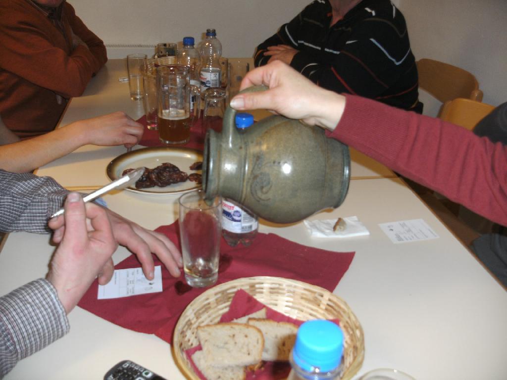 Zehn Möste wurden nacheinander mit neutralen Mostkrügen an die Anwesenden ausgeschenkt, verkostet und bewertet, wobei für Farbe, Geruch/Bukett und Geschmack/Aroma entsprechende Punkte abgegeben werden konnten. Sehr zufrieden war man mit den Mösten allgemein, die allesamt als gut bezeichnet wurden – ein ‚Ausreißer’ war diesmal nicht dabei. Kräftig zugelangt wurde zwischendurch bei Holzofenbrot, Schwarzwurst und Schmalzbrot, was dazu beitrug, dass die Proben überwiegend ausgetrunken und nicht in die bereitgestellten Eimer geschüttet wurden.