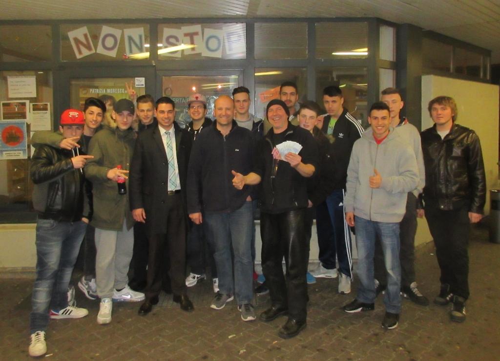 Am letzten Januar-Wochenende fand in Krummwälden zum fünften Mal der Winterfeeez statt. Wie bereits in den vergangenen Jahren spendeten die Veranstalter aus dem Erlös einen kleinen Betrag zur Unterstützung der Kinder- und Jugendarbeit in Eislingen. Dieses Jahr überbrachten der Vorsitzende des Barwagen-Team Julian Walter und der Krummwäldener Zugführer Alexander Mühleis eine Spende in Höhe von 200€ an das Jugendhaus Nonstop. Hänsi Weiß führte kurz durch die Räumlichkeiten und erzählte Interessantes über die Jugendarbeit im Nonstop. Neben der Möglichkeit, Freunde treffen zu können, Playstation zu zocken oder Musik zu hören, werden die Jugendlichen zum Beispiel durch die Wahl eines Jugendhausrates zur aktiven Mitgestaltung animiert. Mit dem sicheren Gefühl, hier eine super Sache zu unterstützen, wurden die Spender mit einem Dankesbeifall und einem Gruppenfoto verabschiedet. |