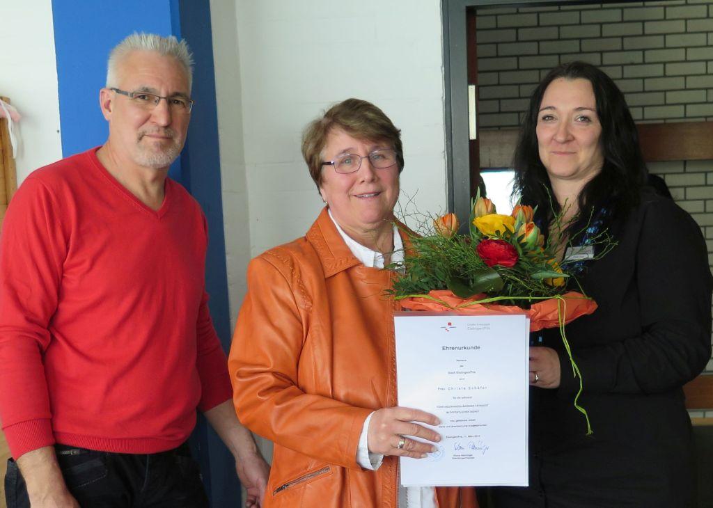 Werner Achaz (li.) und Petra Grus (re.) gratulieren Christel Schäfer zum 25-jährigen Dienstjubiläum