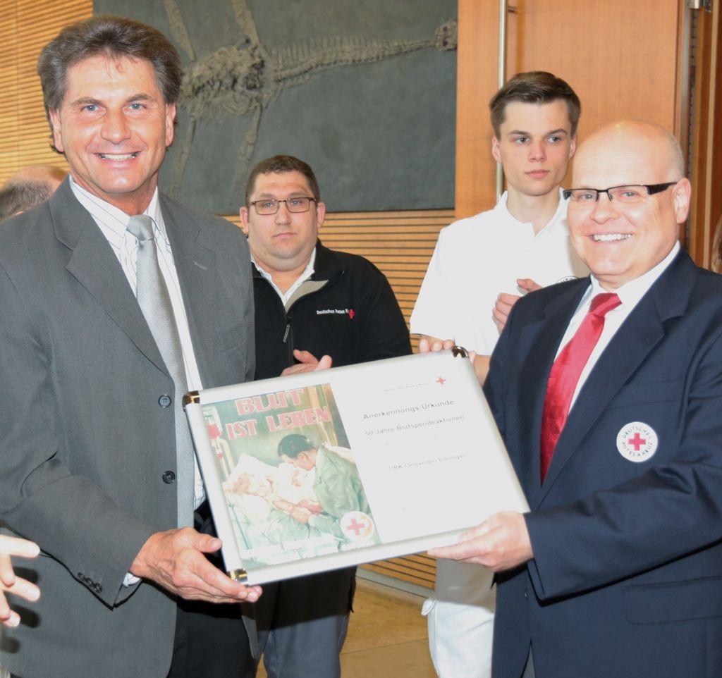 25 DRK-Helfer, zwölf hauptamtliche Krankenschwestern, sieben ehrenamtliche Ärzte „verschleißt“ ein einziger DRK-Blutspendetermin. Trotzdem konnte Oberbürgermeister Klaus Heininger am vergangenen Dienstagnachmittag den DRK-Ortsverein Eislingen und alle anwesenden Spender für „50 Jahre Blutspenden in Eislingen“ ehren und dem Vorsitzenden des Ortsvereins, Thomas Ruckh, für diese Team-Leistung eine Anerkennungsurkunde überreichen. „Wir überlassen die Halle, das DRK-Team aber hat die Arbeit“, erkannte der OB und dankte sowohl dem DRK-Team als auch allen Spendern im Foyer der Stadthalle in Eislingen für „Ihr Herzblut und Engagement“. „Man weiß diese Arbeit erst zu schätzen, wenn man selber oder jemand in der Verwandtschaft auf Blutspenden angewiesen ist“, erklärte er.