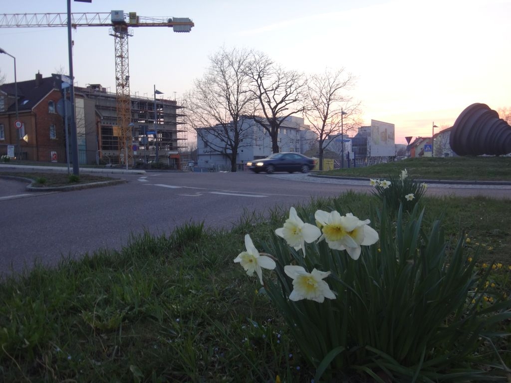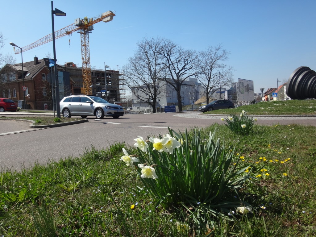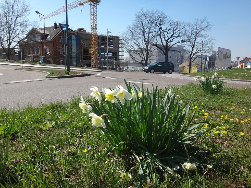 Die Osterglocken, die schon seit Bestehens des Kreisverkehrs am Place de Oyonnax jedes Jahr pünktlich zu Frühlingsbeginn ihre Köpfe in den Himmel recken, werden sich dieses Jahr ganz schön gewundert haben. |