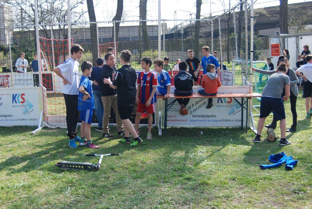 Das street-socker Turnier zog erwartungsgemäß wieder viele Mitspieler an und wurde mit sportlichem Ehrgeiz ausgetragen. Moderiert wurde es von Güney Timor, einem Jugendlichen aus Eislingen, der bei verschiedenen Aktionen immer wieder gerne mithilft. Ohne ihn und die anderen Jugendlichen wie George Condoi, Giovanni Amato oder Matteo Bilas, der für die Musik verantwortlich war, wäre der Aktionstag bestimmt nicht so reibungslos verlaufen. Wichtig bei einem street-socker Turnier ist auch die medizinische Versorgung, die durch Kim Geiger, einer ausgebildeten Ersthelferin gewährleistet wurde.