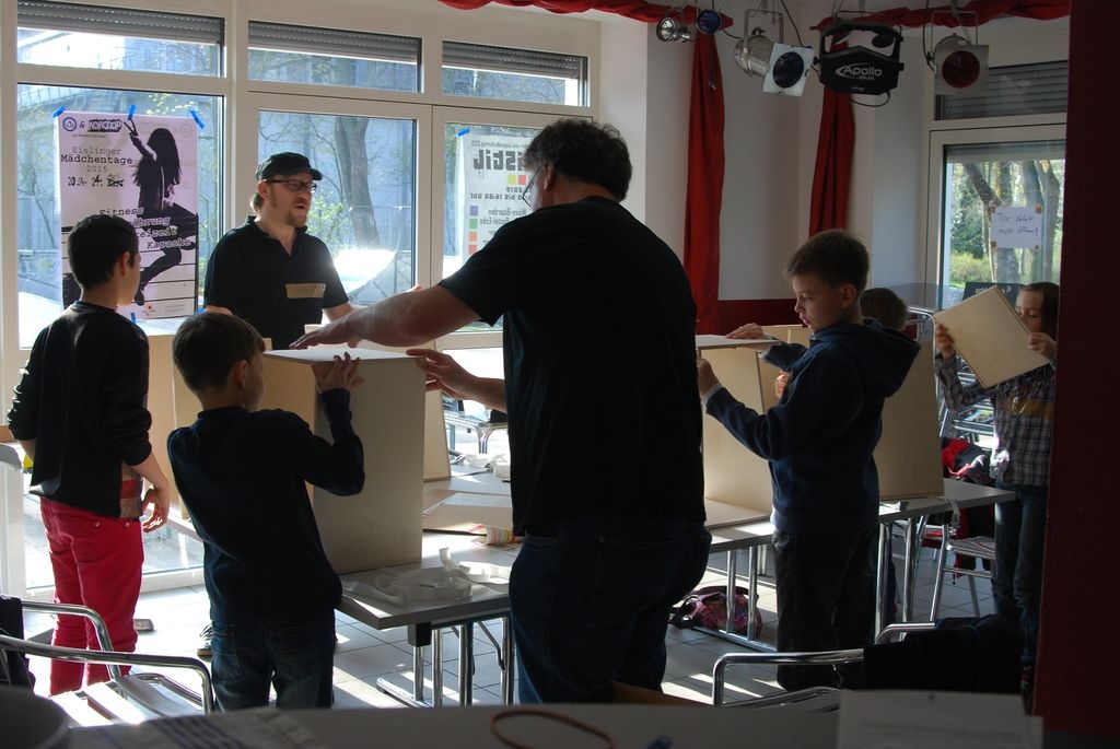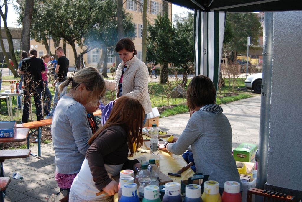 Bereits am frühen Vormittag waren einige Jugendliche der Jugendhäuser Nonstop und Talx beim Aufbau des street-socker Feldes im Schloßpark aktiv. Fast zeitgleich begann unter Anleitung von Martin Sauer der Cajon Workshop, bei dem die Kinder sichtlich Spaß am Bau der Instrumente hatten. Am Nachmittag konnten unter Applaus einiger begeisterter Besucher die Cajons dann gleich bespielt werden. Beim Basteln ging es dieses Jahr um Mosaikbilder auf Kacheln, um filzen, um das Bearbeiten von Itongsteinen und um die Produktion kleiner Elektroautos. Die Kinder bekamen dabei Unterstützung von den Schulsozialarbeitern und waren sehr stolz, etwas Selbstgemachtes mit nach Hause nehmen zu können. Gute Resonanz fanden die Aktionen auch bei den Eltern, die zu Besuch in den Schlosspark kamen und dem Organisationsteam bestätigten, dass die Angebote sehr gut ankommen.