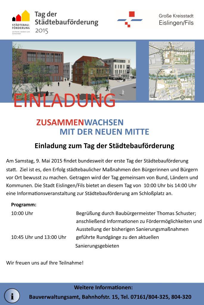Erstmals findet bundesweit der Tag der Städtebauförderung statt. Getragen wird der Tag gemeinsam von Bund, Ländern und den Kommunen. Ziel dieses Tages ist es, den Erfolg städtebaulicher Maßnahmen den Bürgerinnen und Bürgern vor Ort bekannt zu machen. Die Stadt Eislingen beteiligt sich mit einem Informations-stand, an dem Auskünfte zu den Fördermöglichkeiten für private Eigentümer aufgezeigt werden. Ein von Baubürgermeister Thomas Schuster geführter Rundgang durch die aktuellen Sanierungsgebiete mit eingehenden Erläuterungen zu den geplanten Maßnahmen wird um 10:45 Uhr und um 13:00 Uhr angeboten.