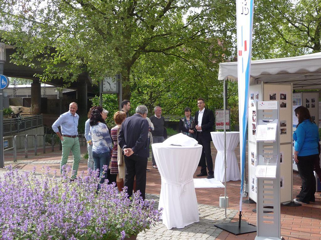 Der Baubürgermeister verwies dazu auf die Schautafeln im Pavillion, in denen dokumentiert wurde, wie sich seit 1983 das Wohnumfeld in den Sanierungsgebieten „Kronenstraße I und II“ mit der Stadthalle, das Gebiet „Westlich der Hauptstraße“ mit der Fußgängerbrücke über die Krumm sowie im aktuellen Gebiet „Südlich der Jahn- und Salacher Straße“ mit der künftigen Neuen Mitte und vielen anderen Maßnahmen deutlich verbessert hat. Bei dieser Gelegenheit kündigte er an, dass sich die Stadt für eine rasche Aufnahme des neu anstehenden Sanierungsgebiets „ Östlich der Hauptstraße“ in das Förderprogramm 2016 intensiv einsetzen wird.