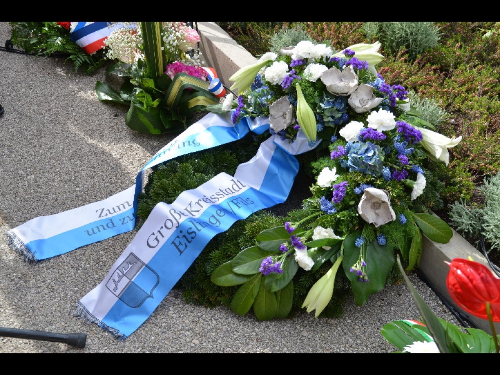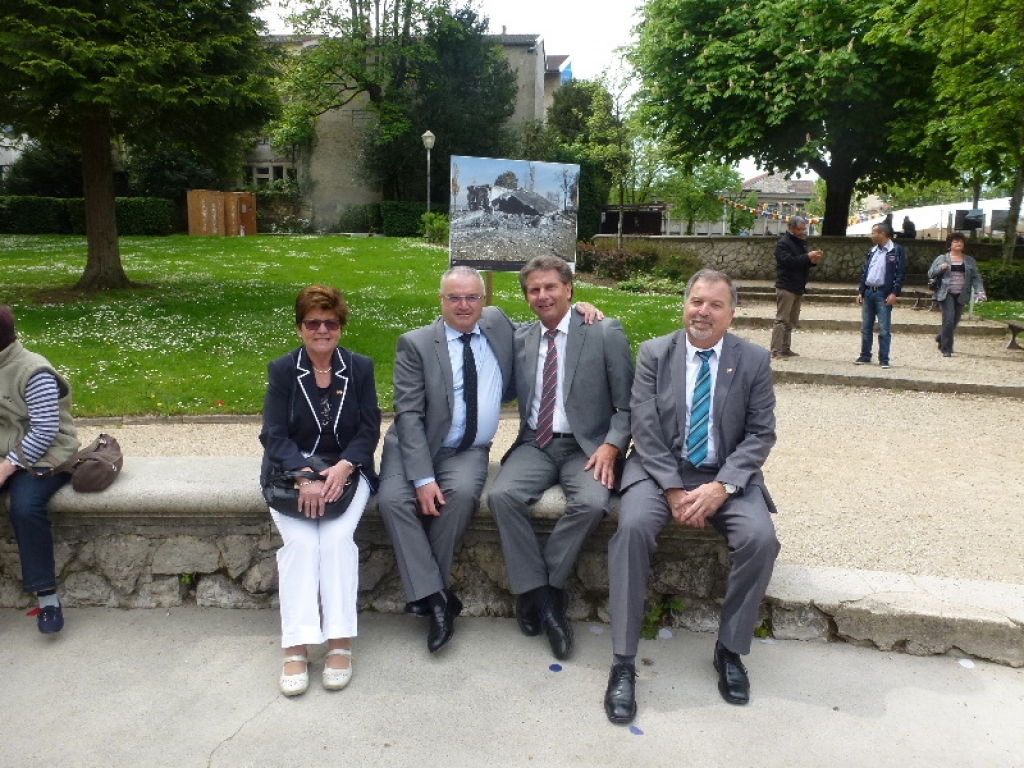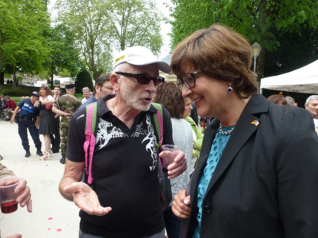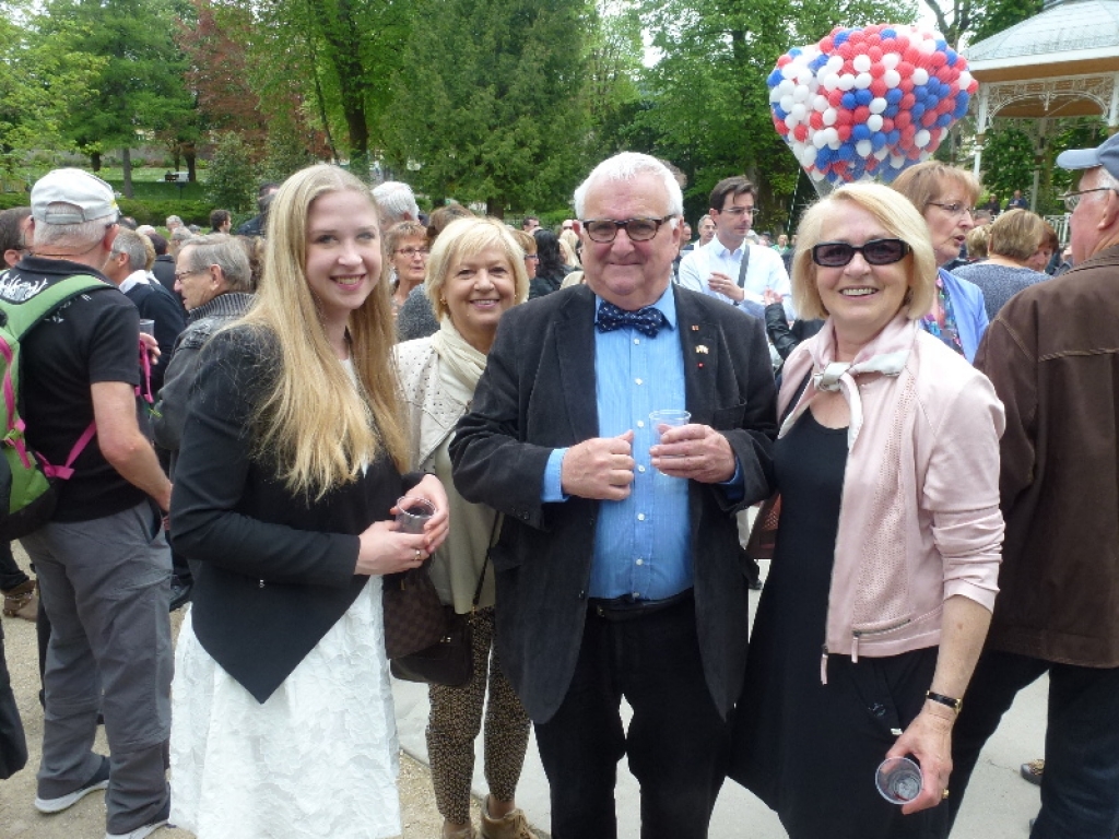 Der Freitag, 8.Mai, und damit Tag der Kapitulation, der Befreiung, stand ganz im Zeichen des offiziellen Gedenkens mit Beiträgen der Politik, des städtischen Orchesters, der Chöre und Gedichten und Liedern der Resistance vor der Kulisse des Kriegerdenkmals. Die französische Kunstflugstaffel flog mehrfach über das Festgelände Streifen in den Farben der Trikolore hinter sich ziehend.