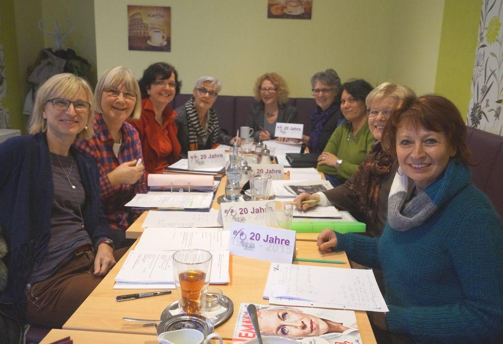 Das druckfrische Jubiläumsprogramm liegt auf dem Tisch, die Ordner mit Planungsunterlagen gut gefüllt, jetzt kann es bald losgehen. Das Planungsteam stellt die letzten Weichen für die Auftaktveranstaltung zum zwanzigjährigen Jubiläum von efa, der Eislinger Frauenaktion. |