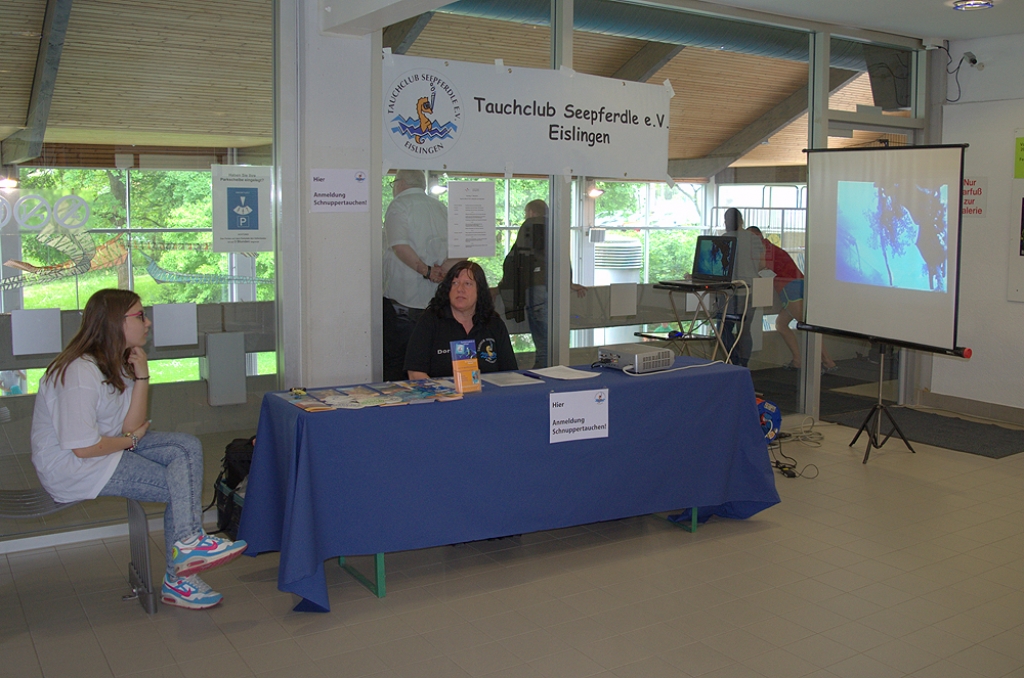 Zum 40. Geburtstag des Hallenbades und des dazugehörigen Festes beim Tag der offenen Tür leistete auch der Tauchclub Seepferdle neben der DLRG und dem TSG seinen Beitrag. Bereits im Foyer des Hallenbades informierten sich die Gäste mittels Flyern und Filmen über den Tauchclub und die Jugendarbeit.