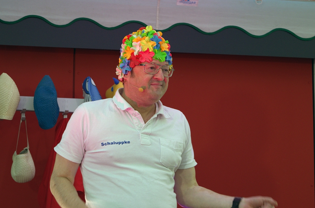 Den Abend ließen die Helfer auf der Sonnenterrasse des neu eröffneten Badcafés ausklingen. Robbie Pawlik alias Bademeister Schallupke sorgte bei den Gästen für permanente Lachsalven und es war ein gelungener Abschluss für das Geburtstagsfest des Hallenbades.