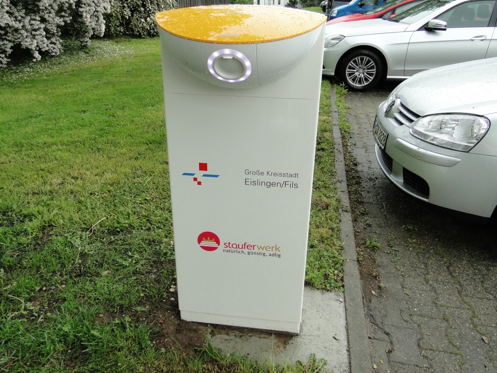 Die erste öffentliche Stromtankstelle in Eislingen hat ihren Standort am Parkplatz beim Hallenbad gefunden. Dort steht den E-Fahrzeugen neben der Zapfsäule, an der die Autos mit Strom des Stauferwerkes „betankt“ werden können, ein Stellplatz für die Dauer des Ladevorgangs zur Verfügung.