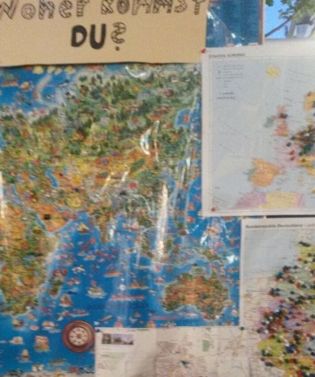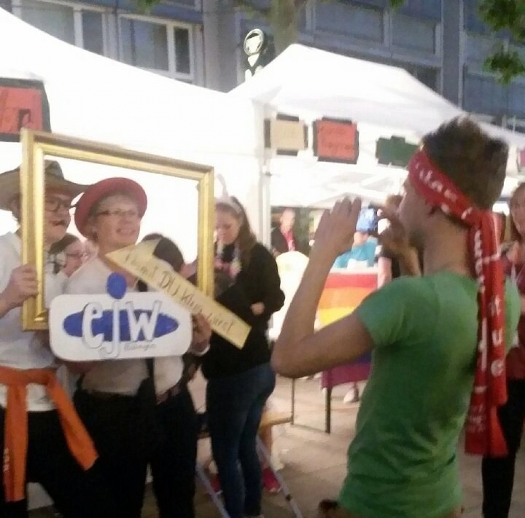 Kirchentagsbesucher konnten sich verkleidet im Bilderrahmen als Erinnerung fotografieren lassen und unter dem Motto 'Woher kommst Du?' mit einen PIn auf der Landkarte ihren Heimatort markieren.