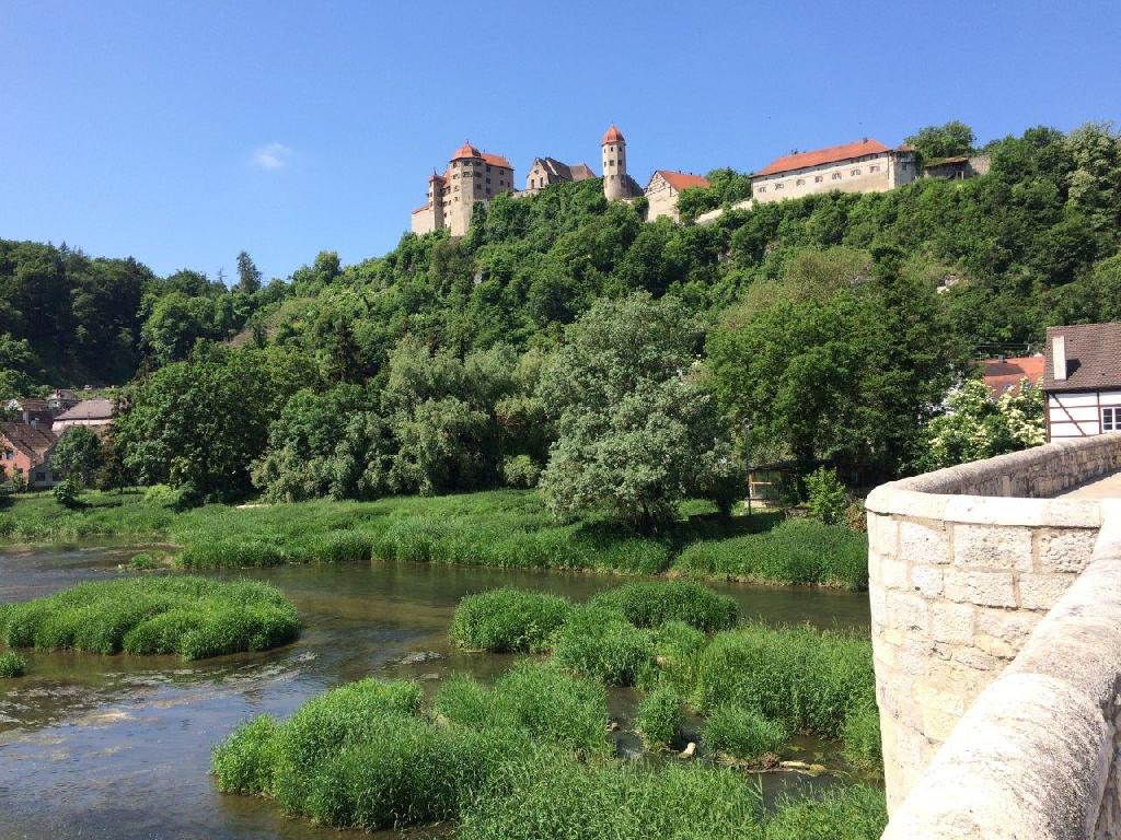 Hoch über dem Ufer der Wörnitz grüßt bereits von Weitem die Harburg. Diese eindrucksvolle, mittelalterliche Burg zählt zu den größten und am besten erhaltenen Burganlagen Süddeutschlands. Bis zurück ins 12. Jahrhundert reicht ihre wechselvolle Geschichte. Bei einem geführten Rundgang erzählte uns die mittelalterlich gewandete Burgherrin viel Interessantes und Wissenswertes über die Menschen aus dieser Epoche, den Alltag in Kriegs- und Friedenszeiten, wobei sie auch die baulichen Besonderheiten der ehemaligen Stauferburg, wie z.B. Wehrgang und Brunnenanlage besonders hervorhob. Zuvor besichtigten wir die zur Burg gehörende, barocke Schlosskirche St. Michael. Gottesdienste fanden seinerzeit meist nur im Sommer statt, da die Kirche nicht beheizt werden konnte (mit Ausnahme der Fürsten- und Kinderempore).
