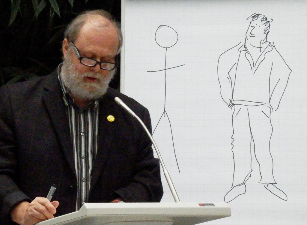 Moderator Wolfgang Schäffer stellte sie als die beste Schüler-Jazz-Combo im Kreis vor. Nach den begrüßenden Worten von Andrea Borgia vom Landratsamt und Angela Murr, der Leiterin des Zentrums für Bildende Kunst und Intermediales Gestalten beim Landesinstitut für Schulsport, Schulkunst und Schulmusik, führte Roland Schmitt, Kunsterzieher am Erich Kästner Gymnasium Eislingen, auf direkte und ganzheitliche Weise ins Thema ein, indem er wichtige Thesen und Aussagen seines Vortrags mit Zeichnungen veranschaulichte und verdeutlichte, die er entweder parallel zu seinen Ausführungen oder in kurzen Pausen mit eleganter Linie auf den Blättern eines Boards entwickelte. So bekamen die Besucher und Besucherinnen etwas zu hören und zu sehen. Zeichnerische Phasen und Entwicklungen der an den Schulen heranreifenden jungen Menschen wurden in seinem Vortrag auf diese Weise ebenso aufgegriffen, wie aufkommendes Abstraktionsvermögen, das Problem von Räumlichkeit in der Fläche, der ewige Widerstreit zwischen echtem Sehen und Wissen beziehungsweise sich im Hirn verankernden Symbolen. Schmitt machte auch deutlich, dass im Zentrum der Zeichnung die Linie stehe, die an sich in der Wirklichkeit so gar nicht vorhanden sei; man zeichne demnach mit einem in der Wirklichkeit nicht vorhandenen Medium körperhafte Gegenstände auf eine Fläche, die so aussähen, als ob sie echt seien und erschaffe so eine Illusion. Darüber hinaus komme man zu einer vertieften Auseinandersetzung mit der dinglichen und sinnlichen Welt, erklärte Schmitt weiter. Auch Erfindungen und Entwicklungen seien zeichnerisch möglich und denk- und machbar. Schmitt schloss seinen eindrucksvoll ganzheitlichen Vortrag mit den Worten: „Zeichnen ist Grübeln mit einem Stift!“