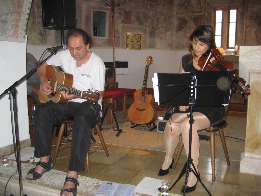 Der Anlass des aktuellen Auftrittes des Künstlerduos war u. a. das 50jährige Bühnenjubiläum von Werner Dannemann, der sich als Komponist, Sänger und Gitarrist auf dem Zenit seiner Musikerlaufbahn befindet. In den drei eben genannten Rollen, die der Künstler in meisterlicher Einheit beherrscht, drückt er die wesentlichen Elemente in geistlichem und weltlichem Musizieren in unglaublicher Vielfalt aus. Freilich kann der aufmerksame Zuhörer Musik aus dem Mittelalter einer Hildegard vom Bingen atmosphärisch nur erahnen, wenn das Künstlerduo Dannemann und Memedovic einen „Antiphon“ (=Leitvers zu einem Psalm) über die Weisheit (=Sapentia) darbietet. Von der Treue, vom Verlus, von der Einsamkeit und von einem Tag im Louvre „Mona Lisa“ musizierten beide Künstler in harmonischer Abstimmung Kompositionen von Werner Dannemann. In den Vertonungen von zwei Psalmen (23: „Vom guten Hirten“ und 34: von „Gottes Schutz“) sowie in der weiteren Dannemann’schen Komposition zu Worten des Heiligen Franziskus von Assisi: „Mache mich zum Werkzeug deines Friedens“ konnte die Zuhörerschaft die glückliche Verbindung des Künstlerpaares in reichhaltigen Melodien mit ebensolchen Harmonien erfahren.