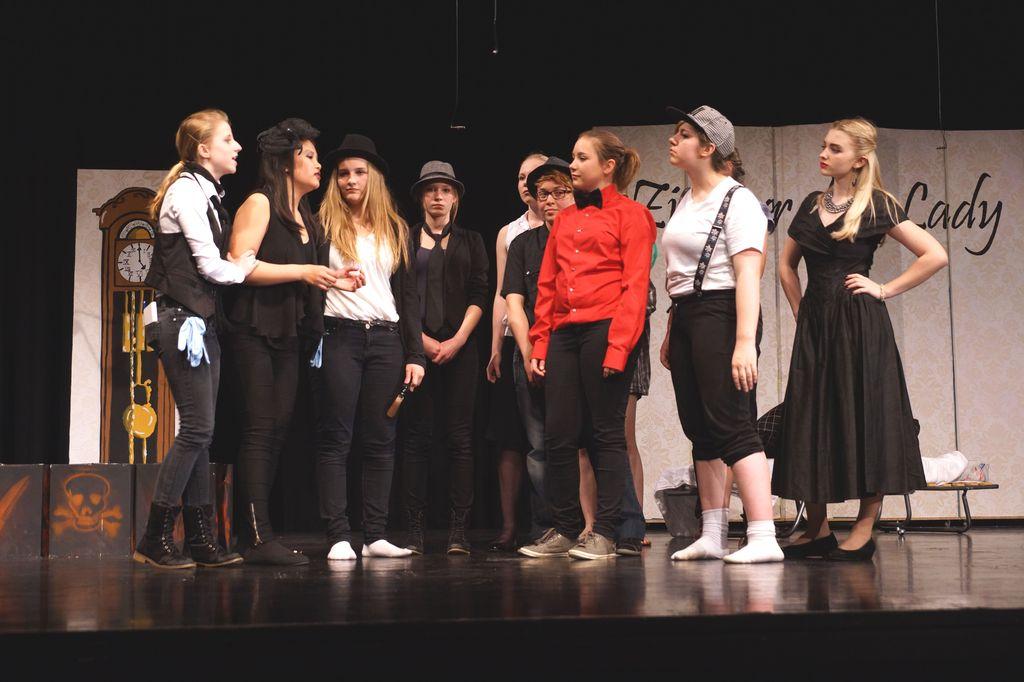 Vor ausverkauftem Haus schlüpften die 17 Schauspielerinnen in die Rollen von Gaunern, Inspektoren, Hotelangestellten und Detektiven. Eine rasende Reporterin mit Drang zur Neugier und einem Gespür für unpassende Situationen darf da natürlich nicht fehlen, sowie eine mysteriöse Dame und ein seltsamer Schmetterlingsforscher. Die Schülerinnen schafften es, jeder Rolle ihren Charme und Humor zu verleihen und überzeugten durch ihr spielerisches Können. Dabei sprang die Freude am Spiel durchweg auf das Publikum über.