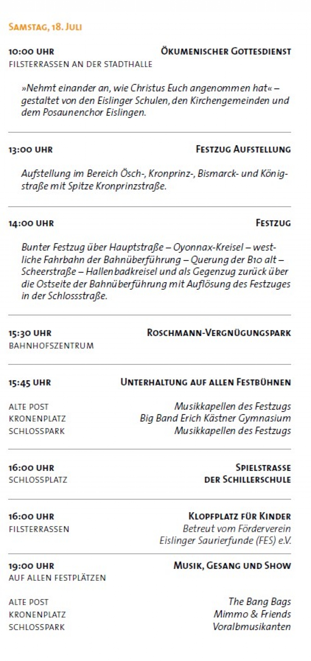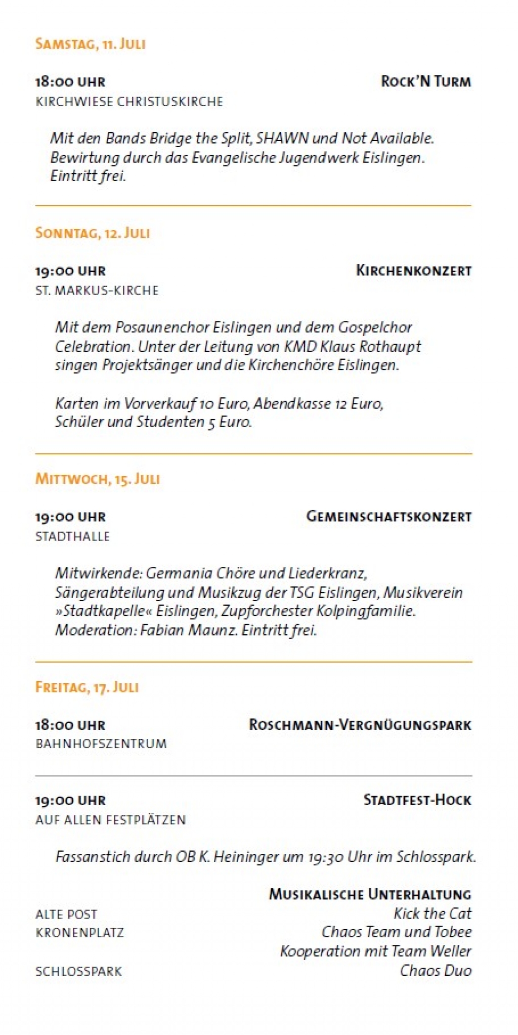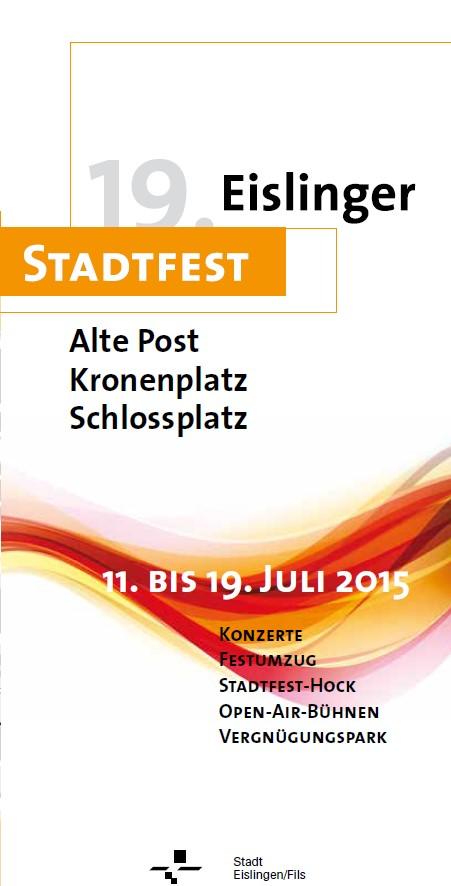 Am Sonntag, 19. Juli 2015 spielt die Stadtkapelle Eislingen zum Frühschoppen am Kronenplatz. Ab 12:00 Uhr startet dann auch auf den anderen Festplätzen das Bühnenprogramm mit Musik und Showeinlagen von Eislinger Vereinen und Gastensembles.