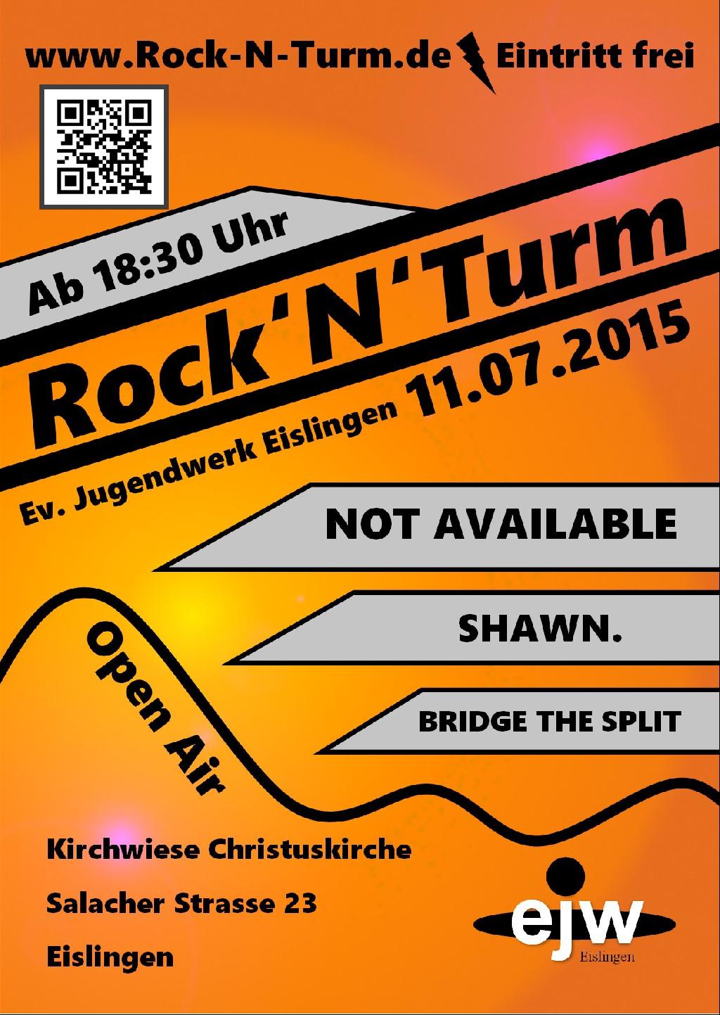 Wenn von der Kirchwiese der Christusgemeinde rockig-fetzige Töne durch Eislingen klingen, dann lädt das Evangelische Jugendwerk zu Rock’N’Turm, dem Auftakt zur 19. Eislinger Stadtfestwoche, ein. Gleich drei Bands spielen am Samstag, den 11. Juli 2015 ab 18:30 Uhr beim Open-Air-Konzert: Not Available, SHAWN und Bridge the Split.