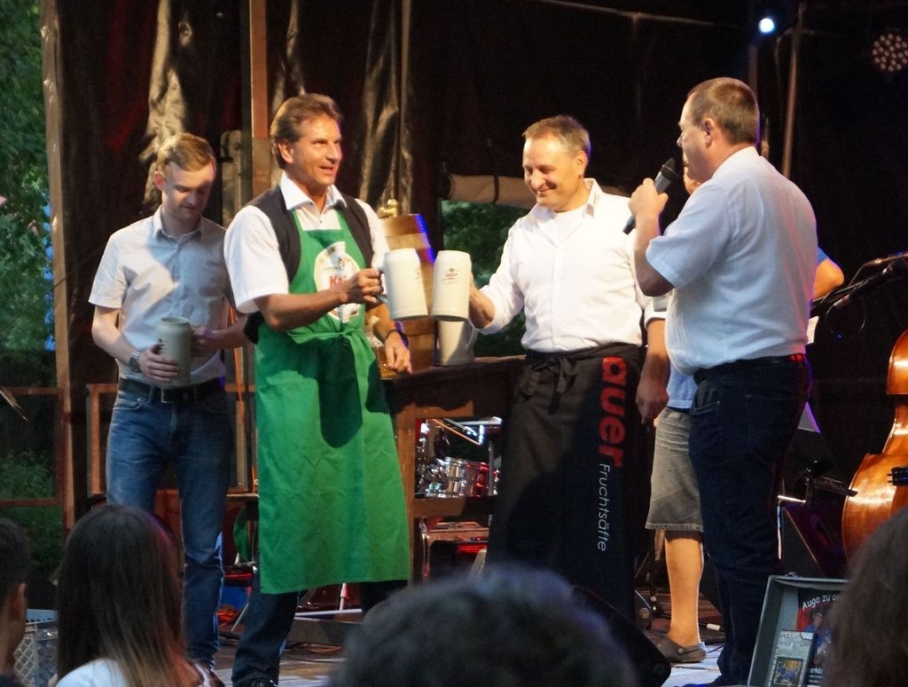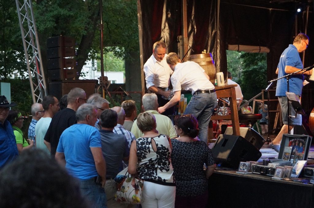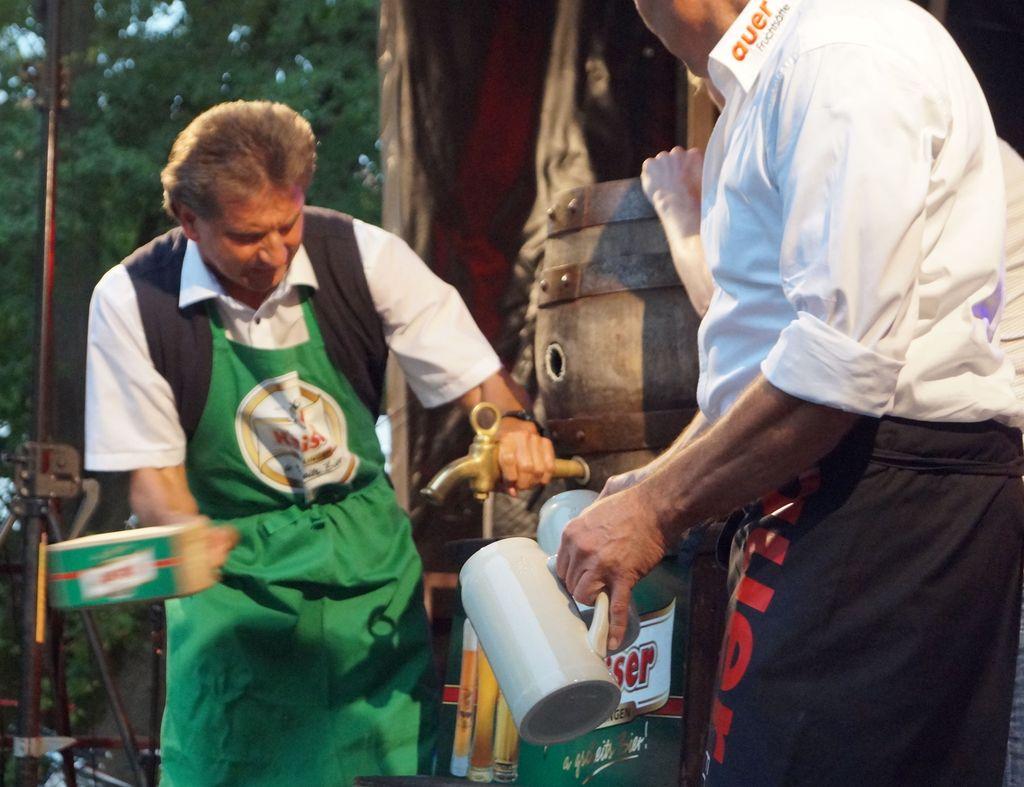 Mit vier kräftigen Schlägen zapfte OB Klaus Heiniger das erste Festbierfaß, dieses Jahr auf dem Festplatz Schloßpark, an. Traditionell wird das Eislinger Stadtfestwochende vom Stadtoberhaupt wechselnd auf einem der drei Festplätze eröffnet. Bei lauer Sommernacht wurde auf dem Kronenmarkt, dem Festplatz Alte Post und im Schloßpark ausgiebig bis nach Mitternacht gefeiert. |