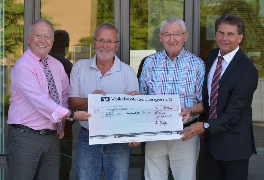 Strahlende Gesichter bei der Scheckübergabe: In der Mitte die Vertreter der ARGE, v. l. Willi Hörmann und Rolf Riegler, eingerahmt von den Vertretern der Stiftung Herbert Fitterling (links) und Klaus Heininger (rechts).