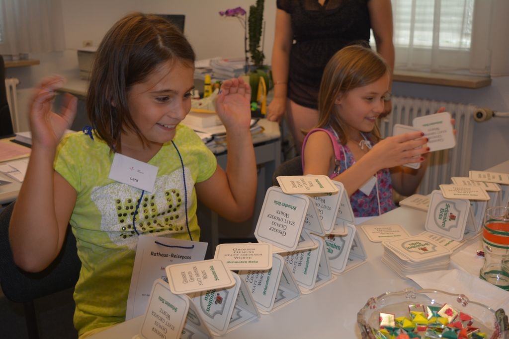 Bei der Leiterin der Meldebehörde, Iris Kutschera, konnten wissbegierig sämtliche Reisedokumente auf Hologramme und eingebaute Mikrochips untersucht werden. Spannend war der fälschungssichere Fingerabdruck. Anfassen und ausprobieren des Scanners war ausdrücklich erwünscht. Handwerkliches Geschick dagegen war im Baurechtsamt gefragt. Der Wettbewerb um den Bau des höchsten Bierdeckelturms, stellte sich als ernst zu nehmende Aufgabe heraus. Jubeln durfte am Ende Pauline, die bei Amtsleiter Rolf Lennartz und Tamara Leopold mit ruhiger Hand die Konkurrenz im Auge behielt und ihr Haus ins Finale rettete. Eine kühle eisige Erfrischung wartete bei Oberbürgermeister Klaus Heininger – Probesitzen im Chefsessel inclusive. Dass im Gespräch keine Fragen zur Stadtentwicklung an erster Stelle standen, versteht sich von selbst. Cola ist das Lieblingsgetränk unseres Stadtoberhaupts und geheiratet hat er vor 27 Jahren auf dem Rechberg. Das stillte vorerst den Wissensdurst nach Privatem und es konnten reichlich Punkte, bei seinen speziellen Quizfragen über Eislingen gesammelt werden.