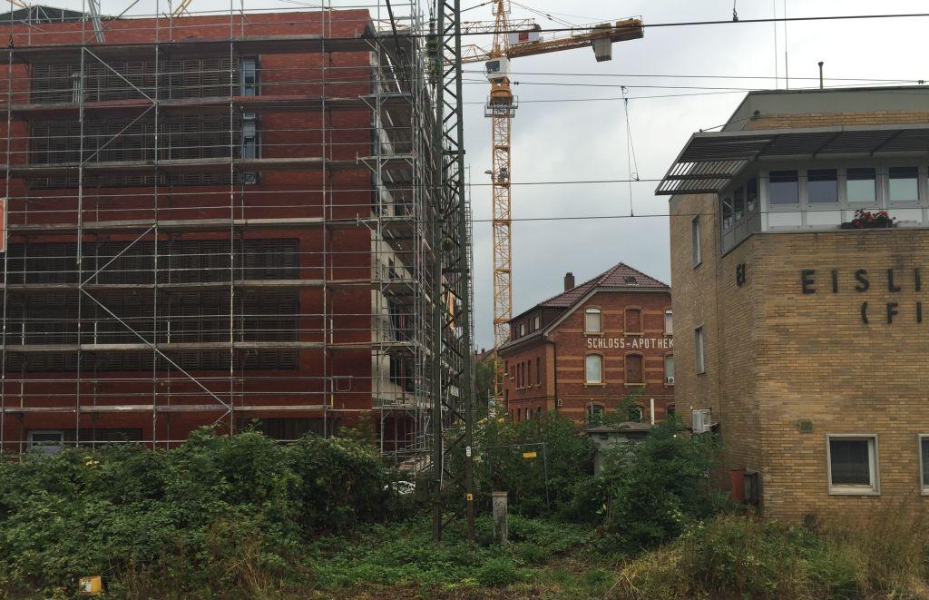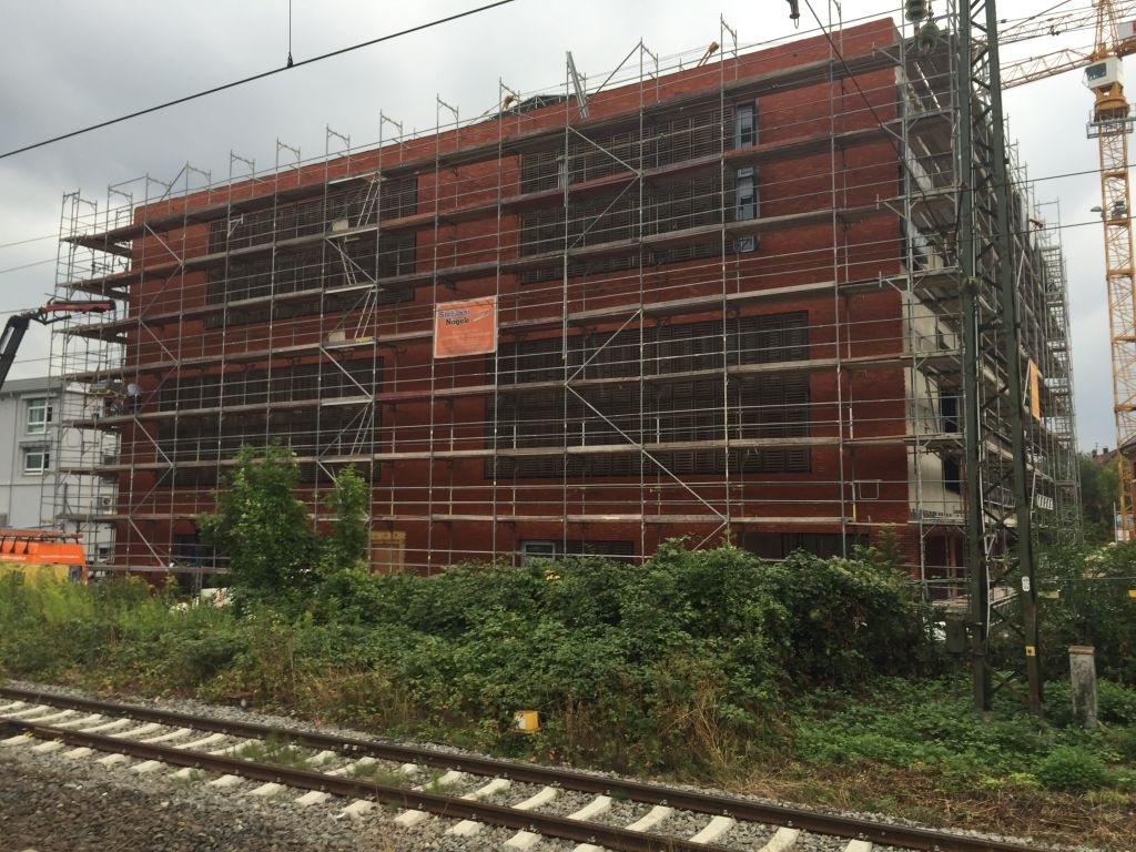 Um den Eislinger Rathausneubau in die Umgebung einzupassen, wurde dem neuen Gebäude im favorisierten Entwurf eine Klinkerfassade vorgesehen. Auf der Bahnhofsseite ist diese Wandgestaltung jetzt schon gut zu sehen. |
